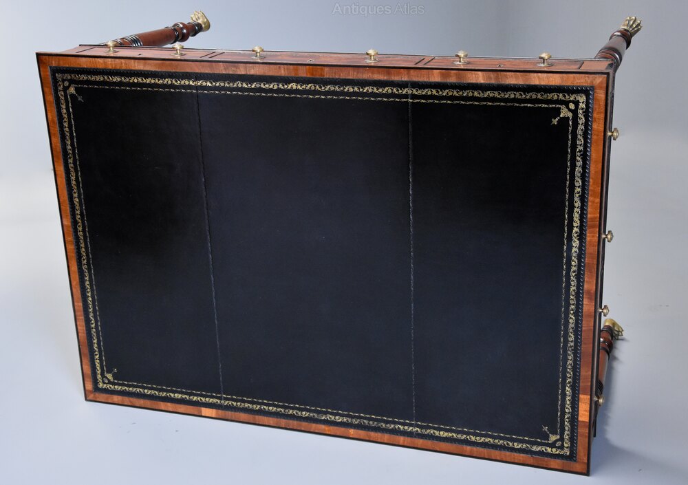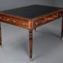 This writing table consists of a finely tooled black leather top surrounded by a mahogany crossbanded edge with ebony line.