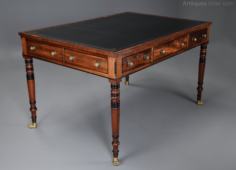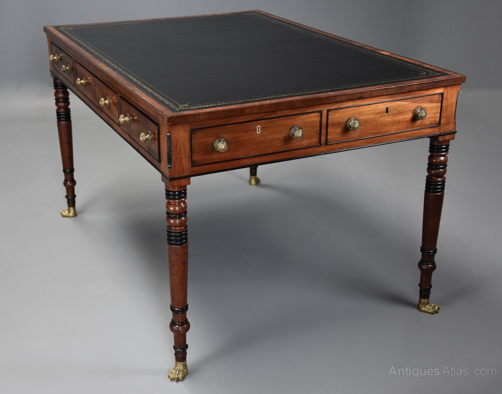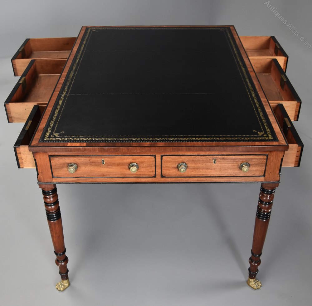 A large early 19th century Regency six drawer writing table of fine, faded patina (colour).