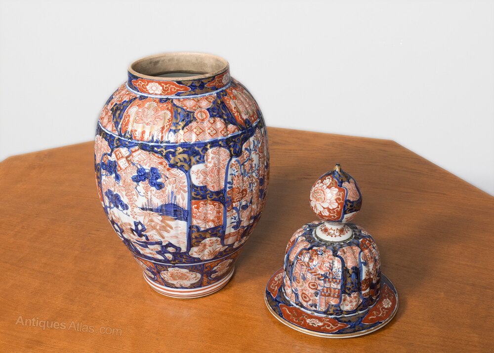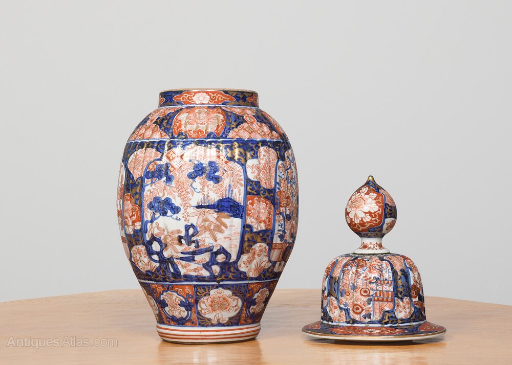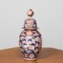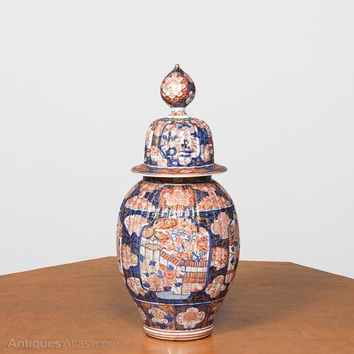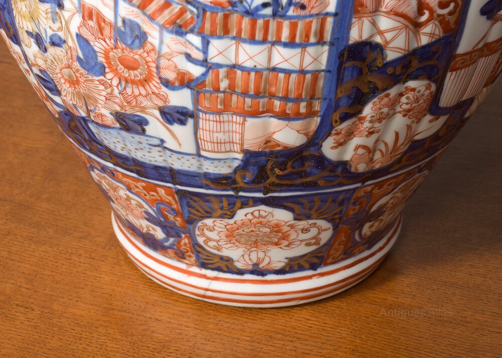 Circa 1870. Large fluted and lidded Imari vase with quality hand-painted decorations. The fluted lid with a finial with panels of classical Imari russet coloured chrysanthemums within blue panels. The main fluted body with further panels of chrysanthemums, other flowers and garden scenes. In perfect condition.