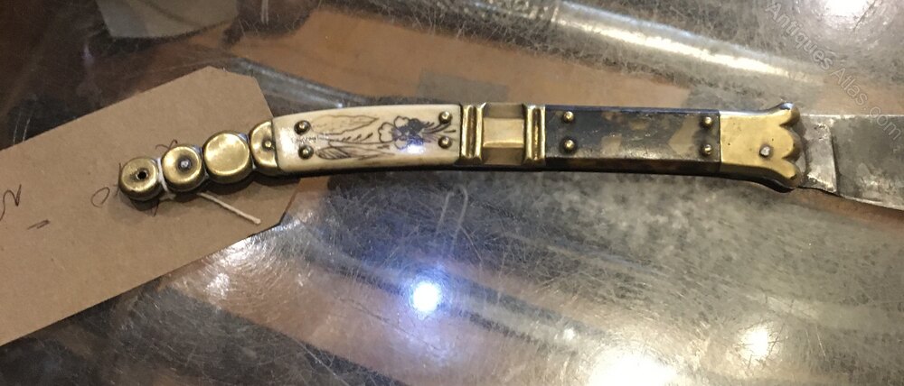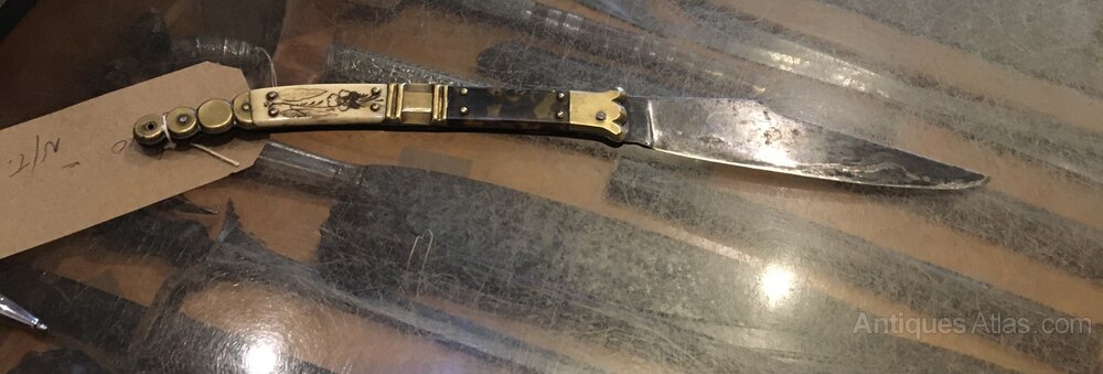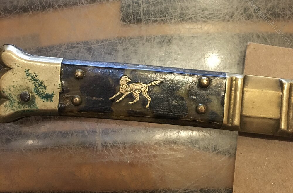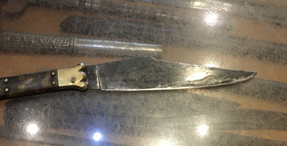 A classic folding Spanish folding knife from the 1860-1880 this one has an inserted silver hunting dog on one side it’s not missing any panels the blade is solid in the hilt and straight a good example of one of these classic folding knives.
