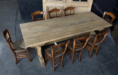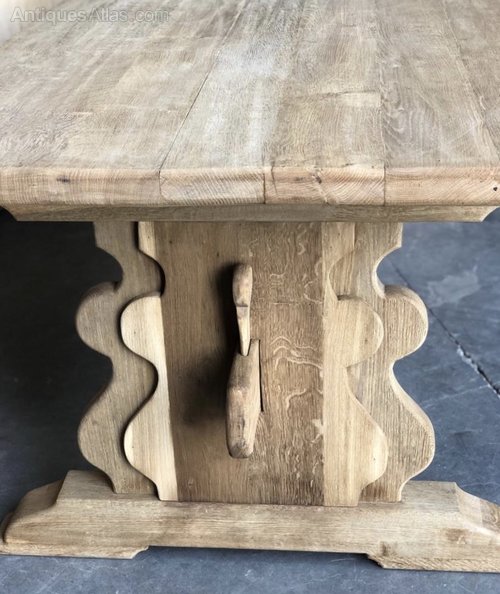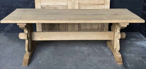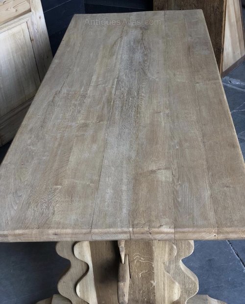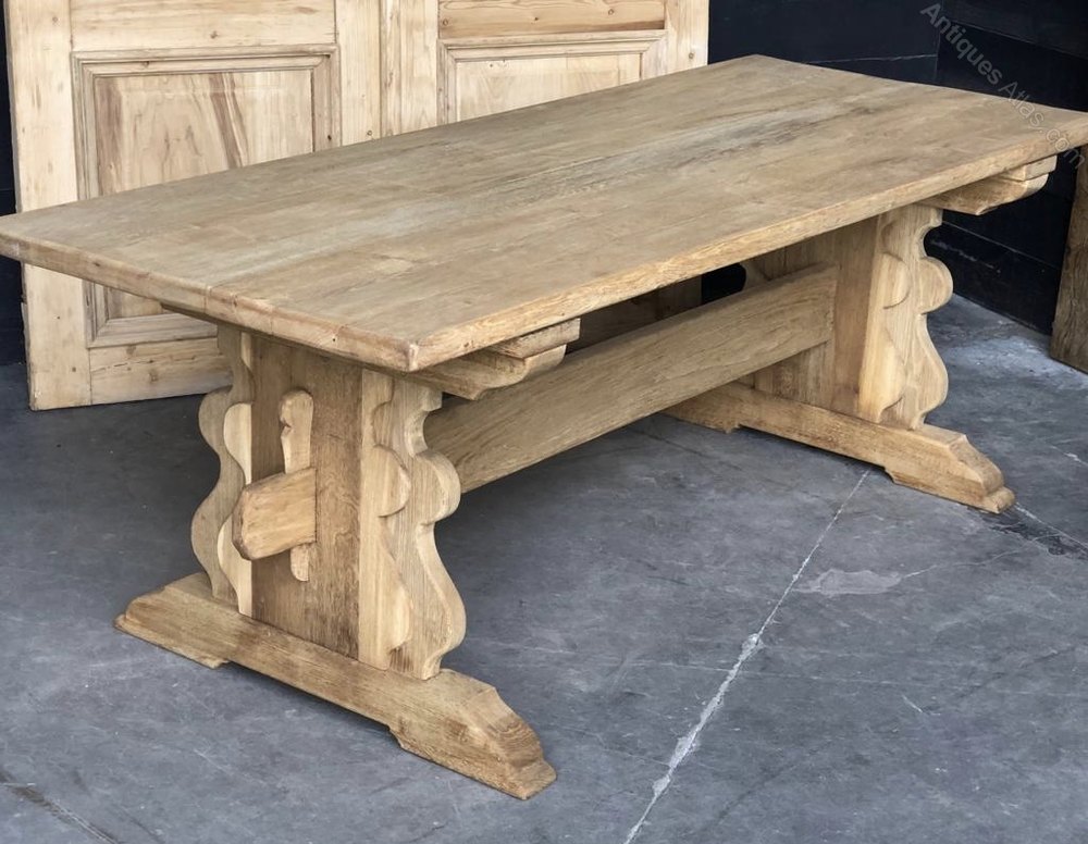 A wonderful French Farmhouse Kitchen Refectory Dining Table, made from solid oak in the mid 19th Century. Very usual trestle ends, a really nice feature I have seen this style before. We have bleached the table for the modern look but also it can now be waxed to any shade or colour desired.
