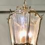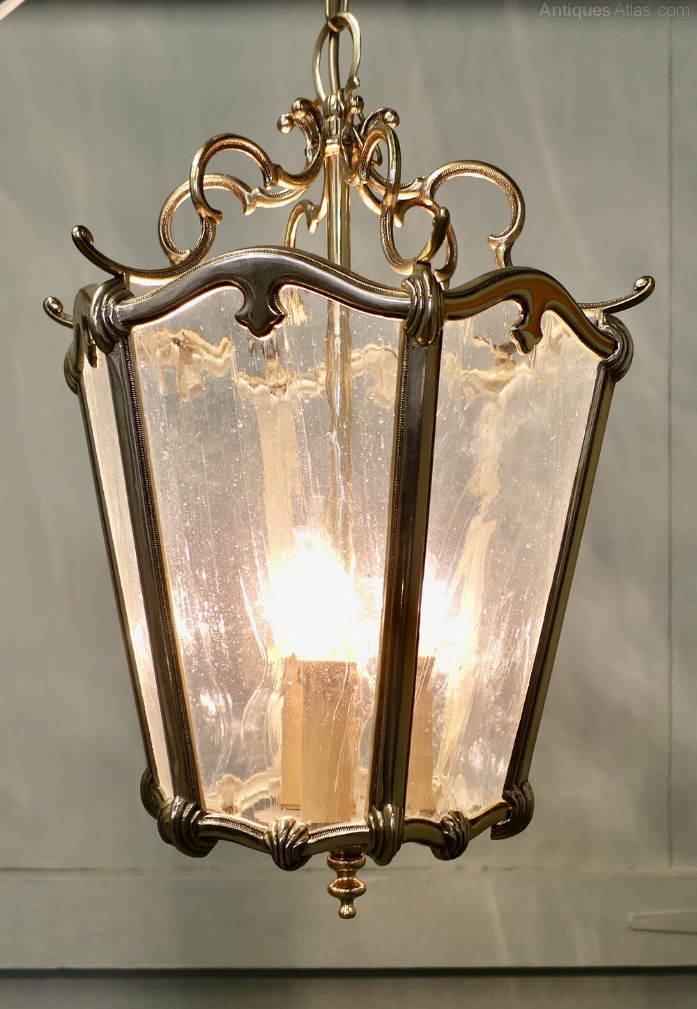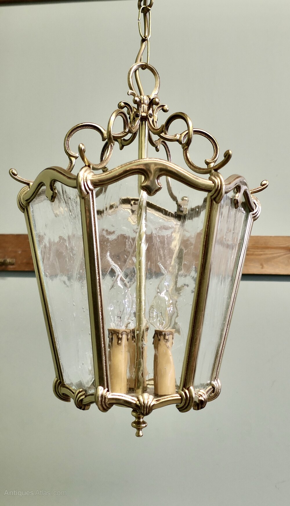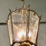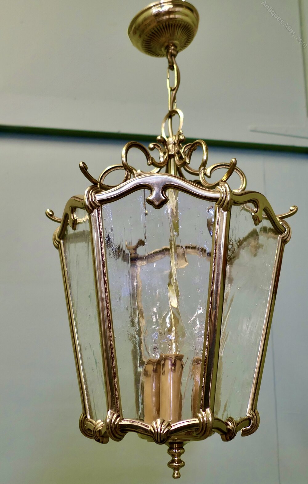A superb quality heavy brass lantern, the light has 6 glass panels, the glass is hand made giving the Lantern a period look with delightful imperfections and flaws in the glass