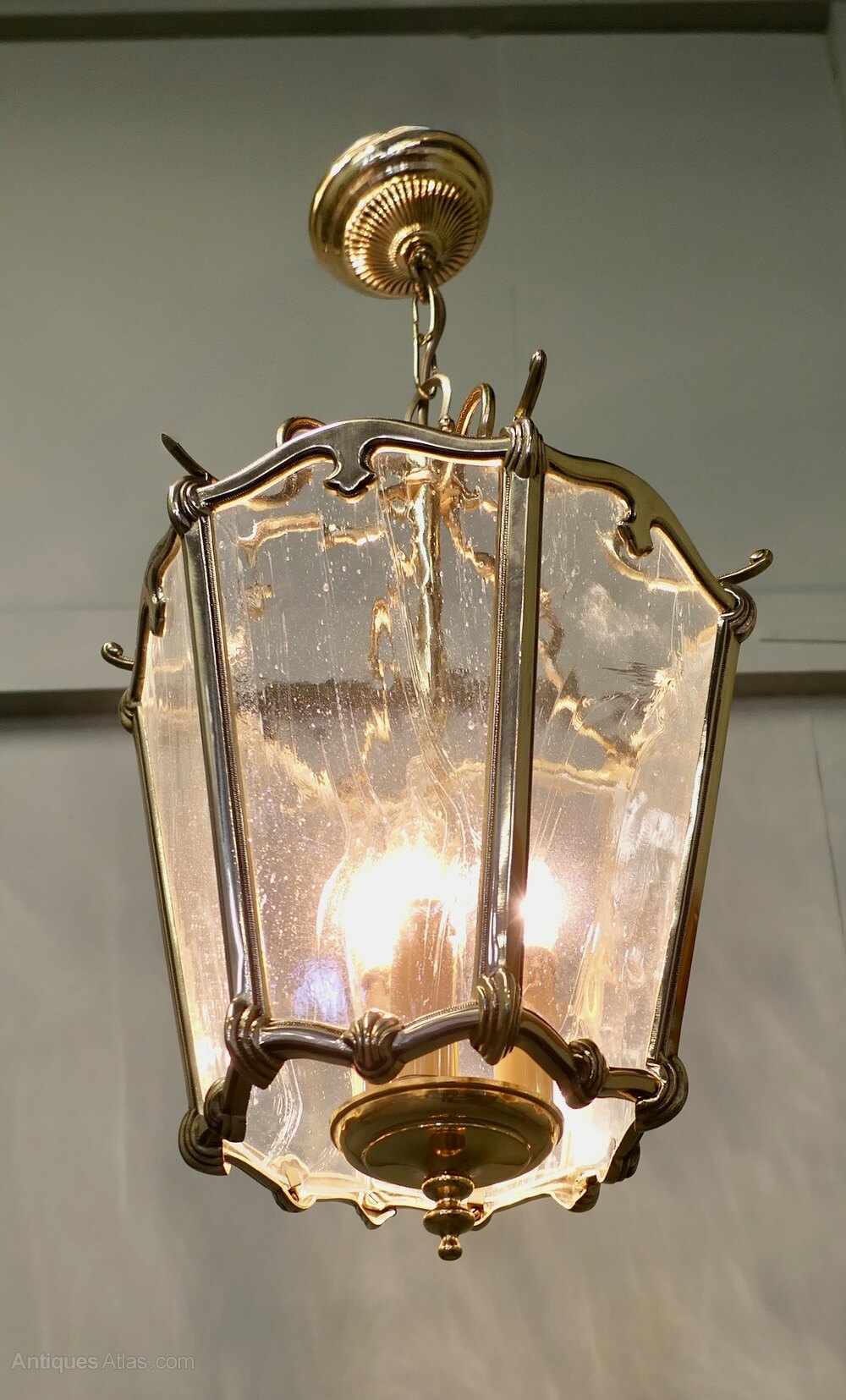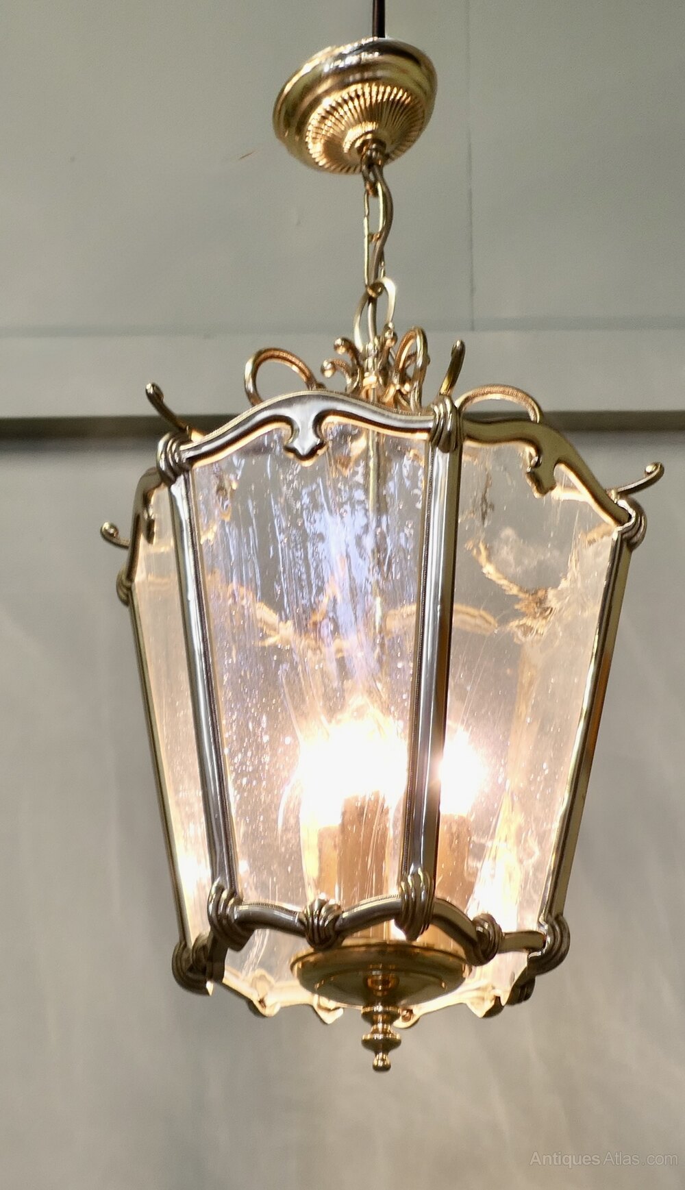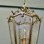 The lantern is decorated in the French style, it hangs on a chain from a brass ceiling rose and gives an attractive light when lit