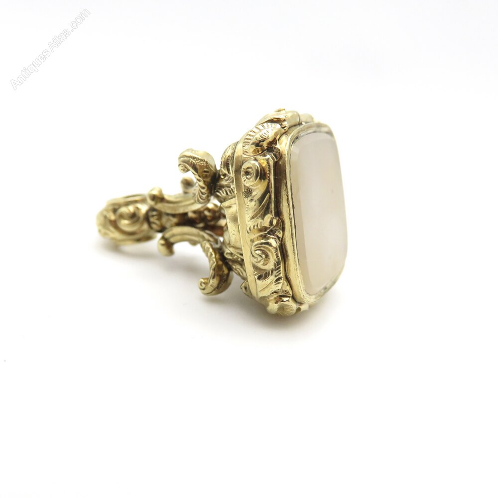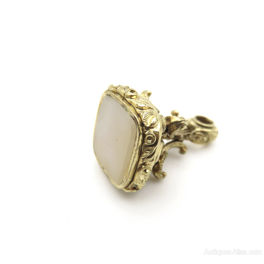 This is a large scale fob, finished in gilt metal and holding a lovely, square, milky, chalcedony that is plan and flat so, if you wished, you could have it engraved.