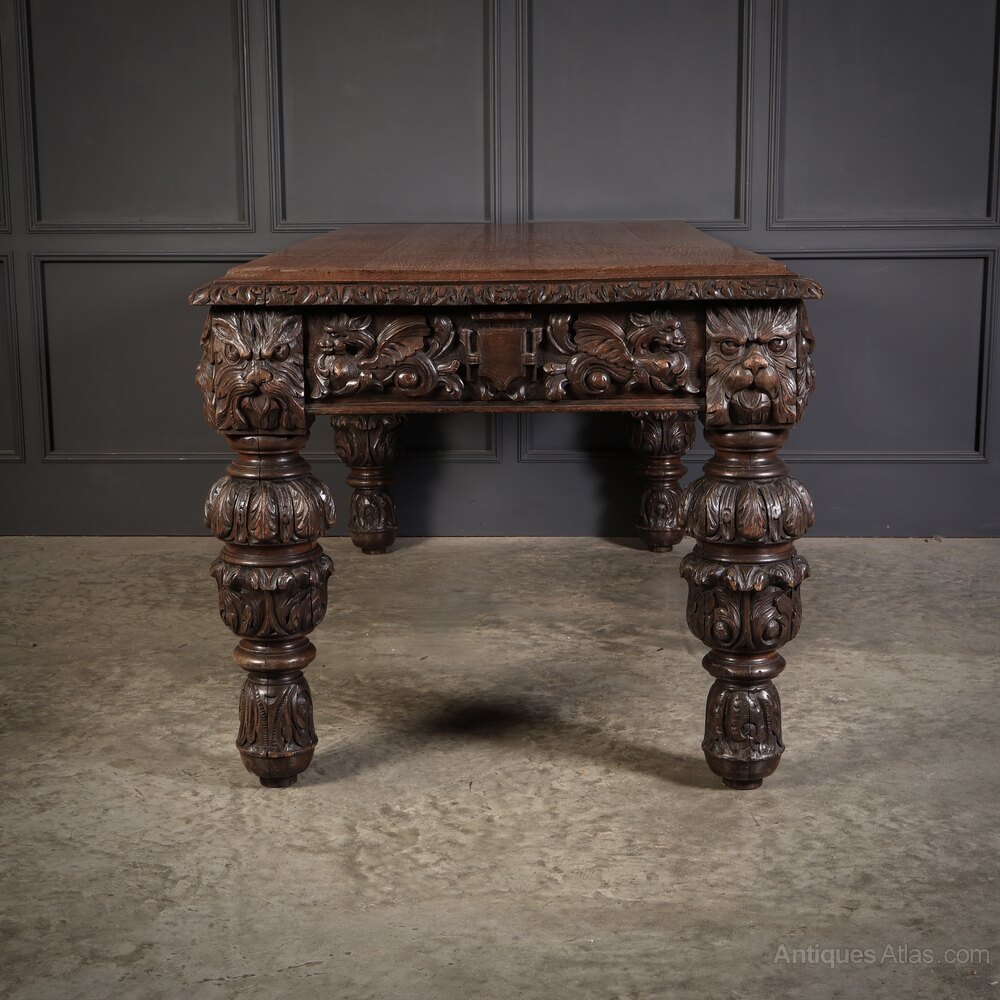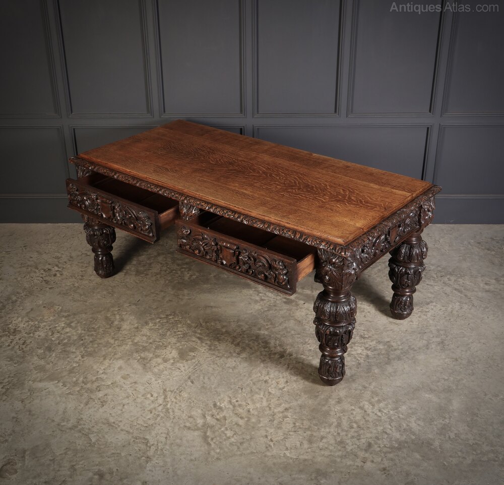 An exceptional large carved oak writing table of superb presence and quality. The table is fitted with two drawers to the front, each framed with finely executed carving, including striking depictions of the Green Man amongst scrolling foliage and animal motifs.