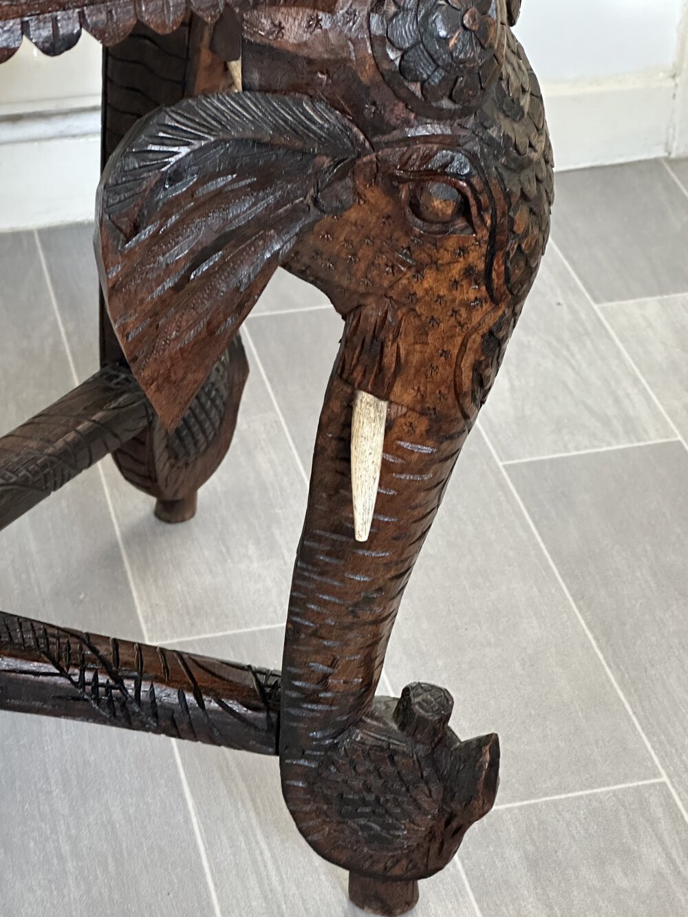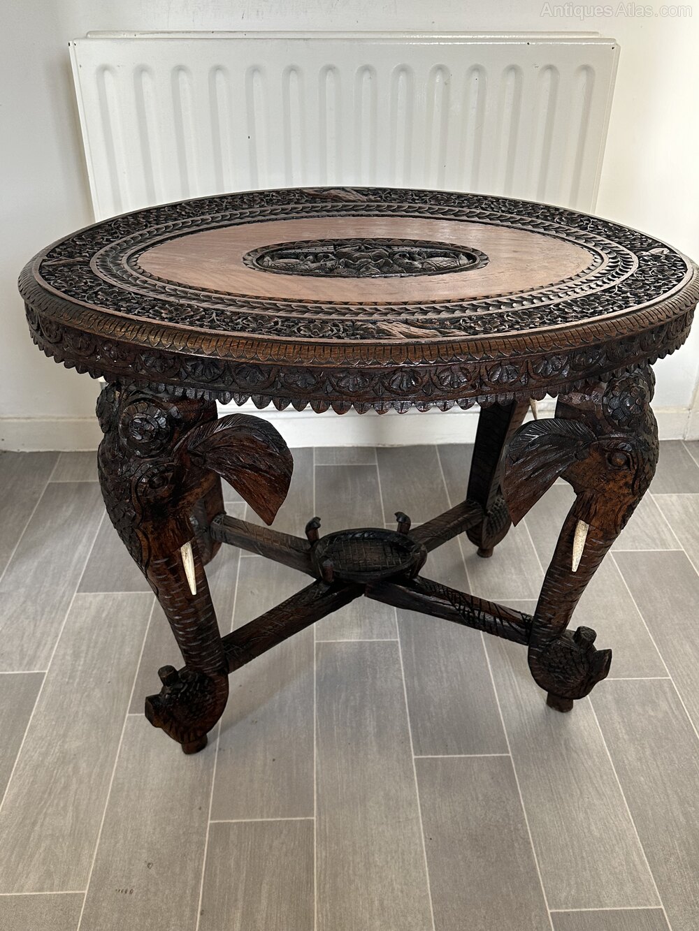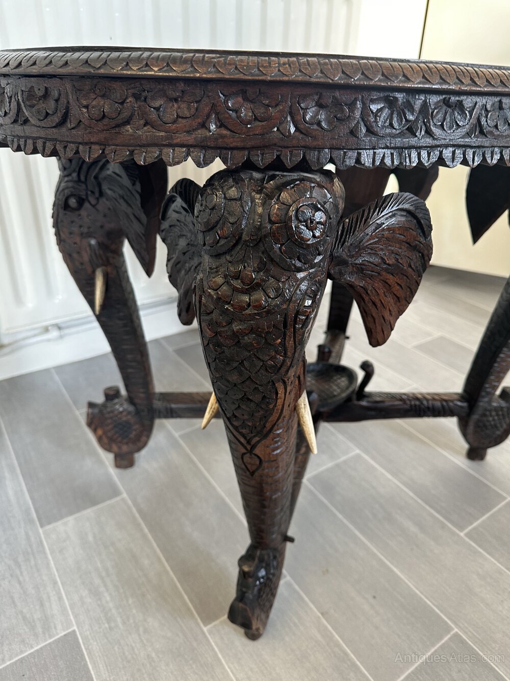 20th. Century. The oval top having a gadrooned centre with a carved edge scrolling flowering vines, birds and mythical beasts. The table is supported on 4 carved elephant heads with bone tusks and their trunks forming the legs. The strengthening cross stretchers joined in the centre by a small turned bowl overseen by stylised cobra snake heads. In good overall condition with 1 or 2 bumps and bruises associated with age and use.