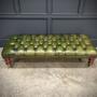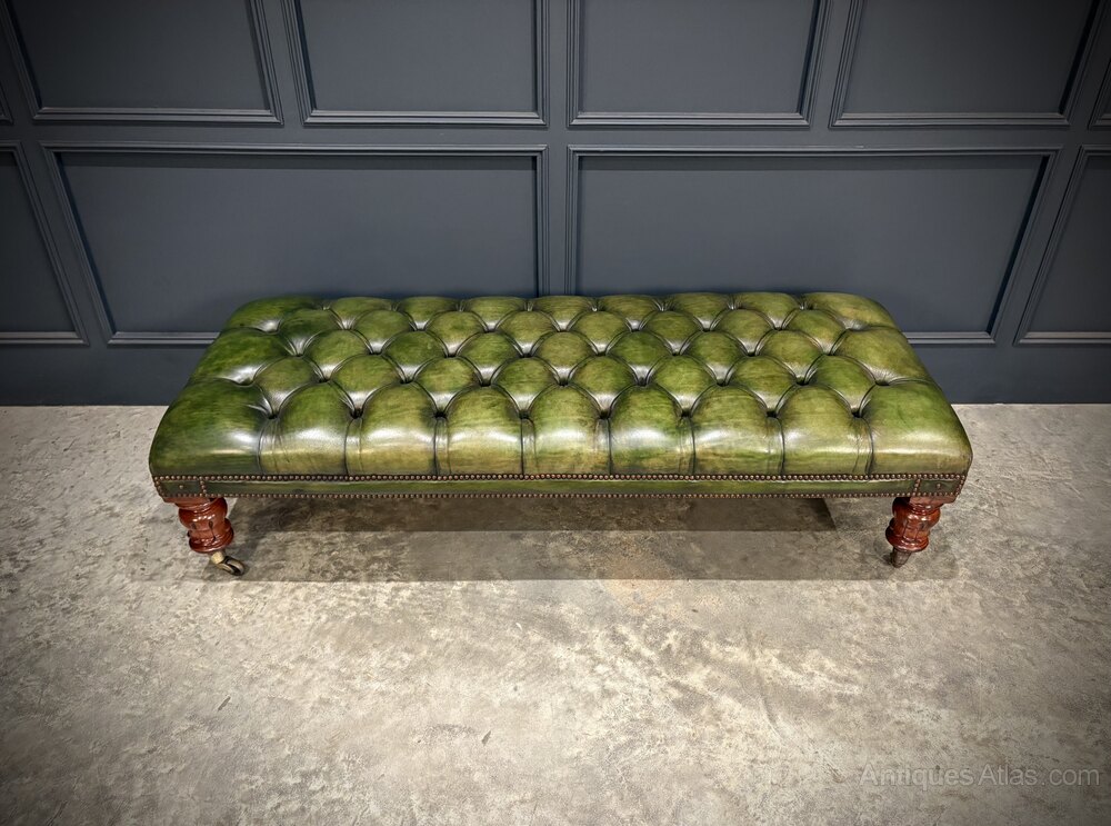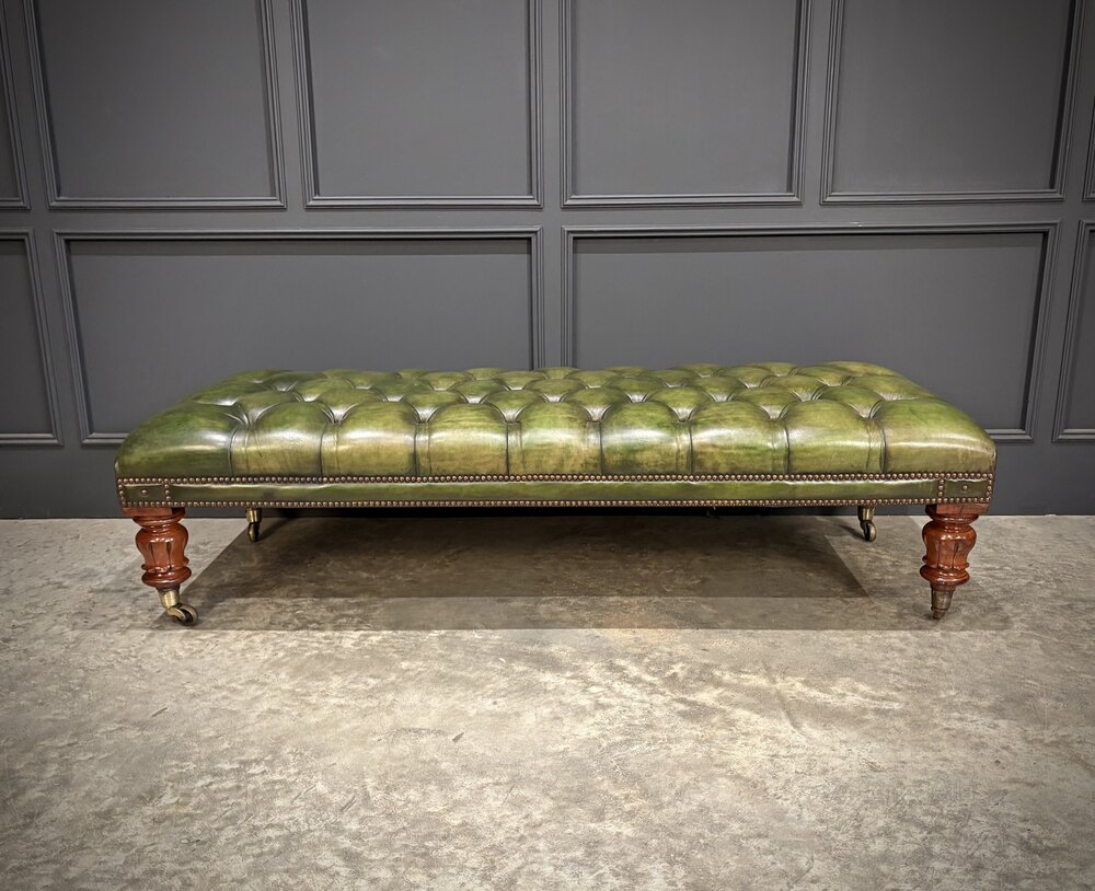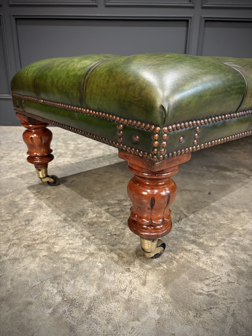 A fine large William IV mahogany footstool, traditionally upholstered in hand-dyed green leather.