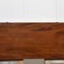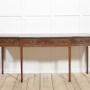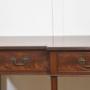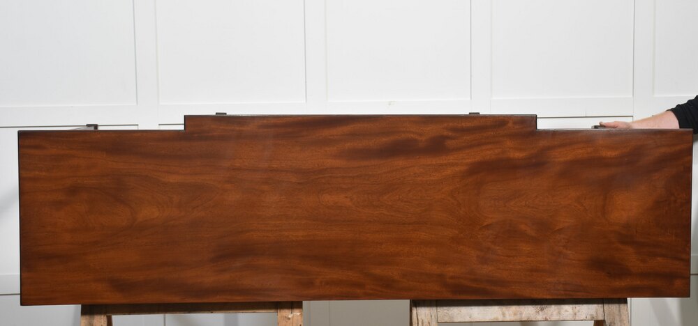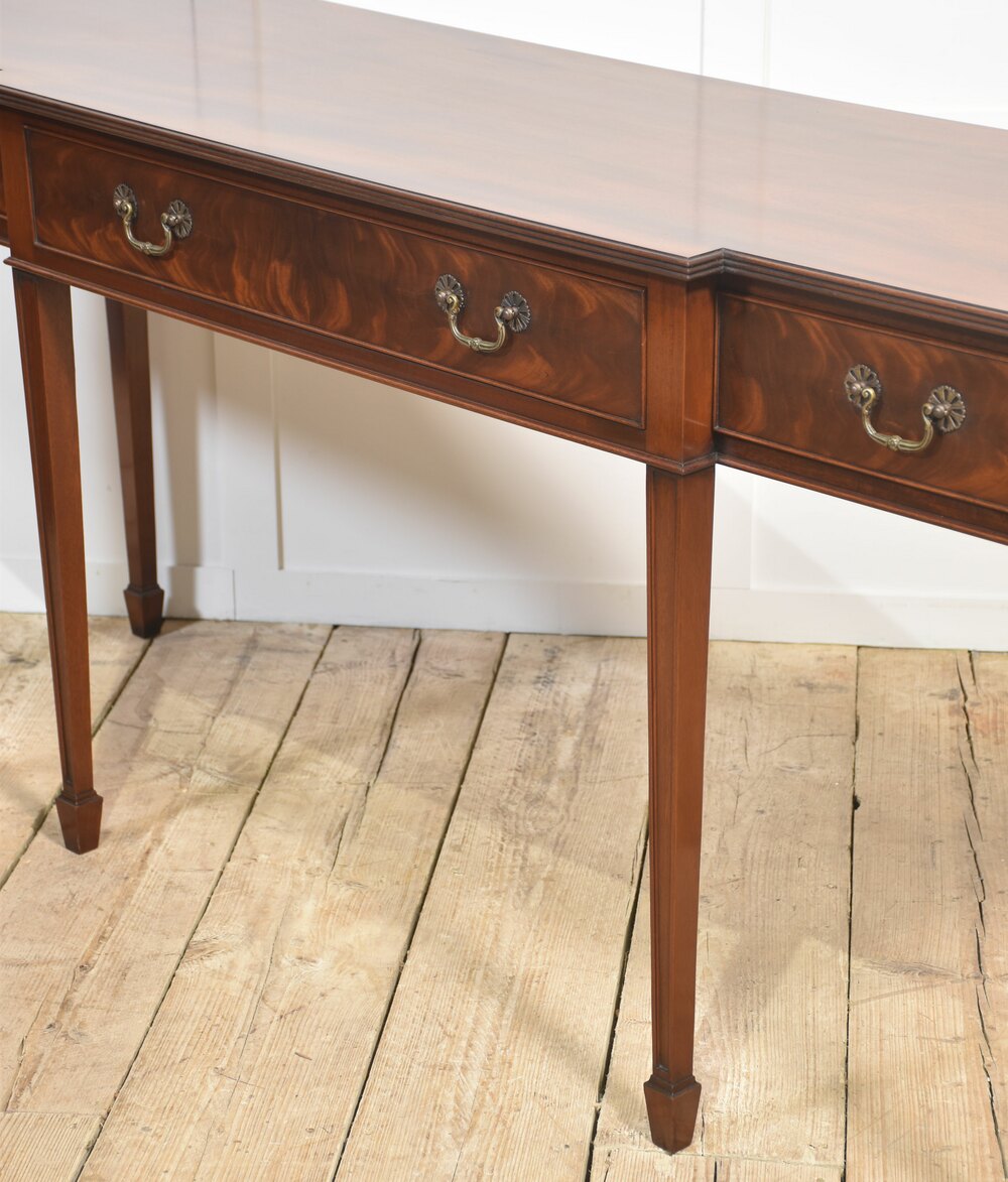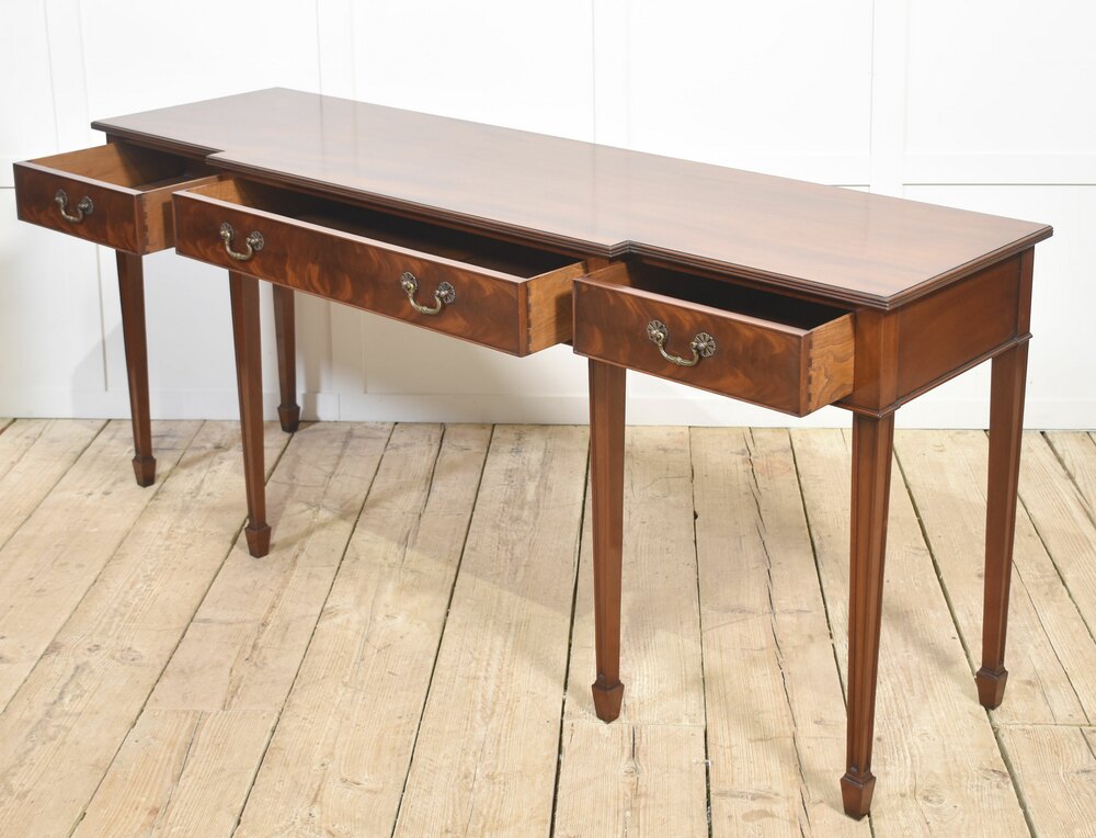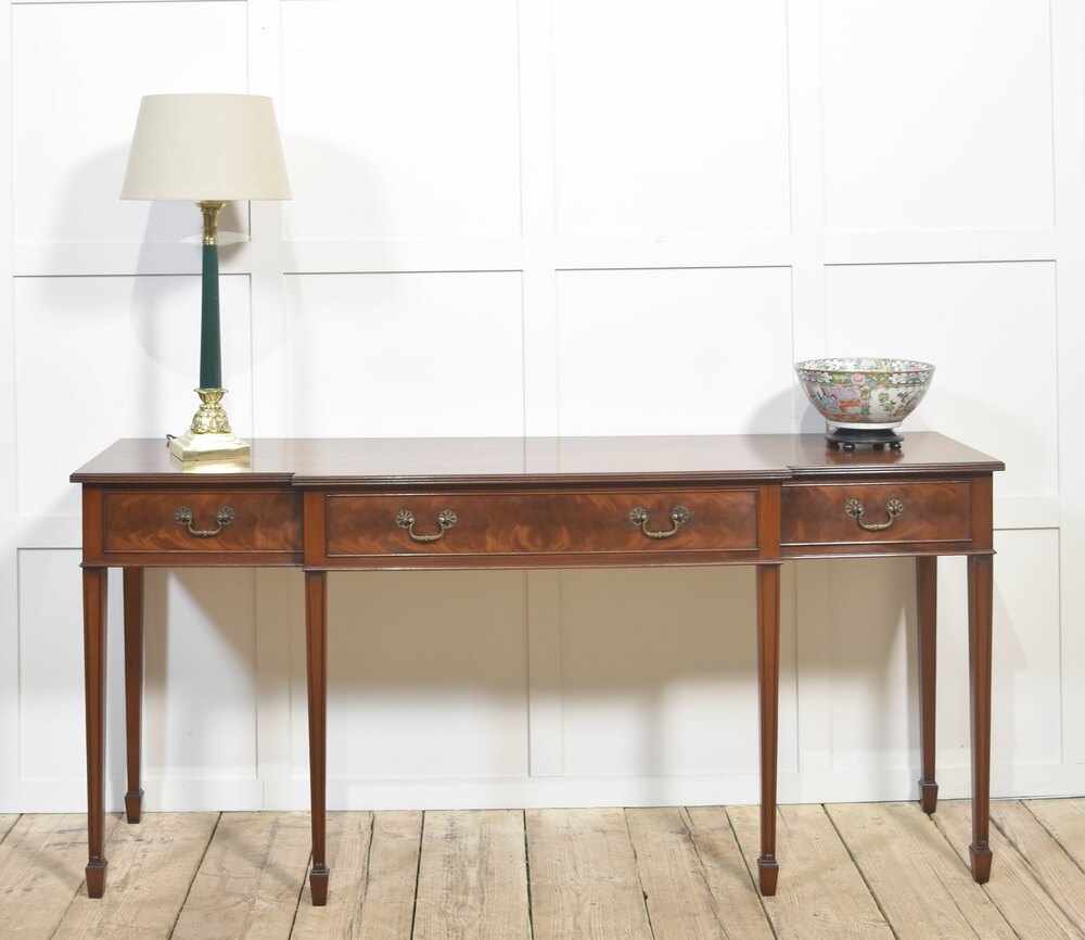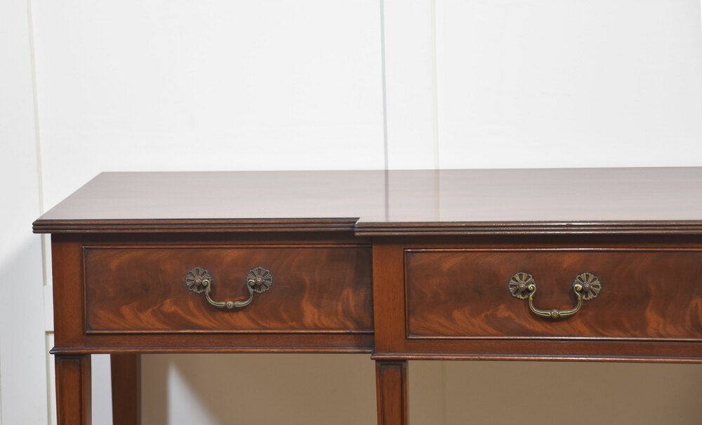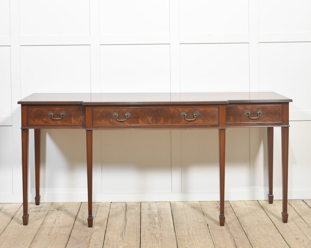 Mahogany serving table, the large rectangular well-figured breakfront top above three freize drawers fitted with brass handles. All raised on six tapering legs terminating in spade feet.