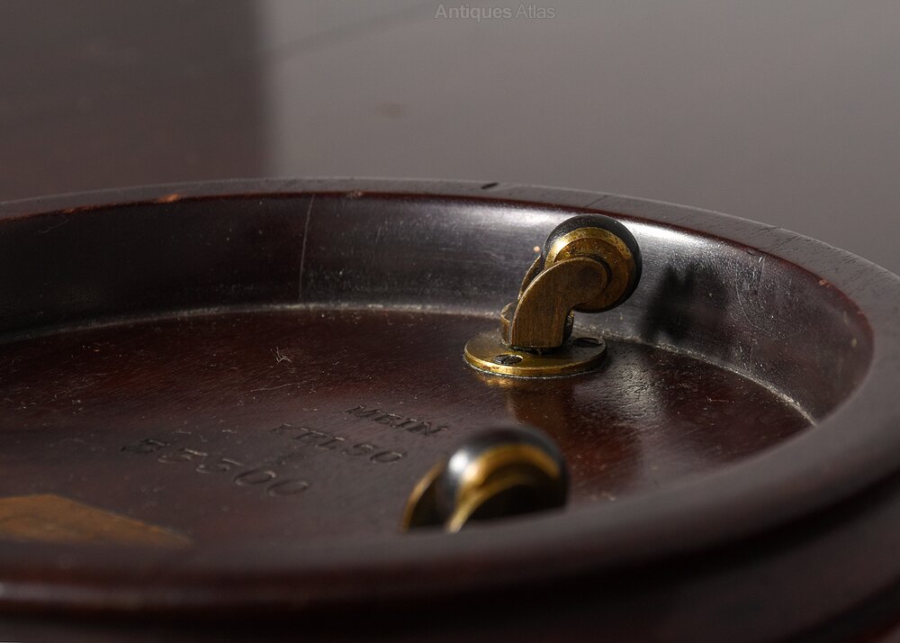 Circa 1820. A large circular wine coaster by ‘James Mein of Kelso’, the circular dish top with a small circular raised section in the center and a broad fore edge with rim beneath, the underside with three original brass and leather castors, the name ‘Mein Kelso ‘and number 3300 stamped into the wood with the faded ‘James Mein of Kelso’ label with canted corners. James Mein, Kelso 1784 – 1830. One of his major commissions included supplying furniture to Floors Castle, home to the Duke of Roxburgh.