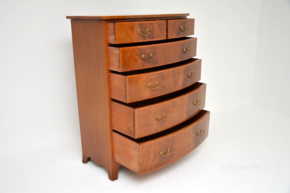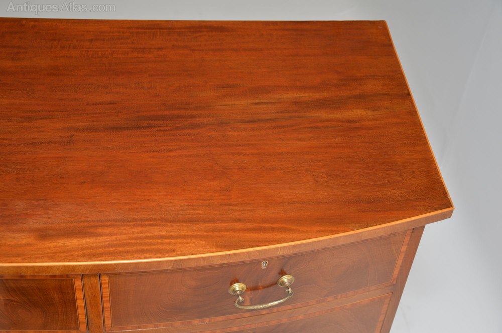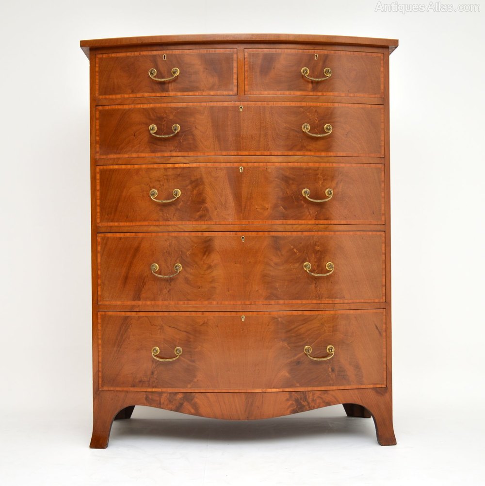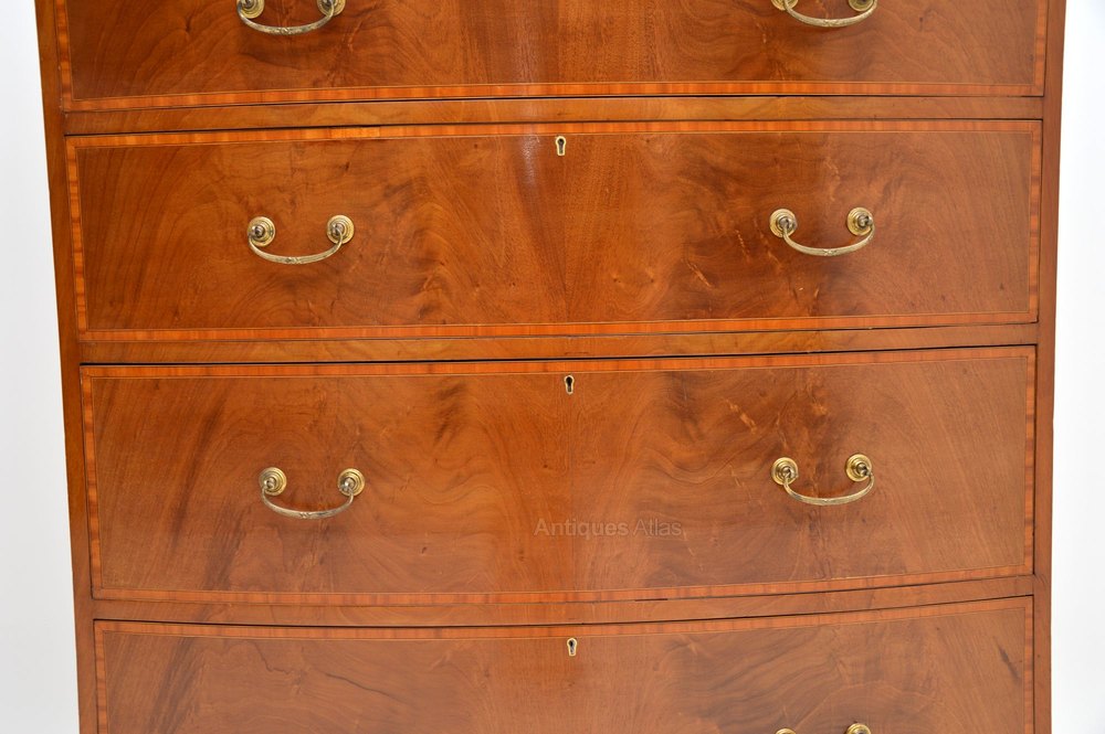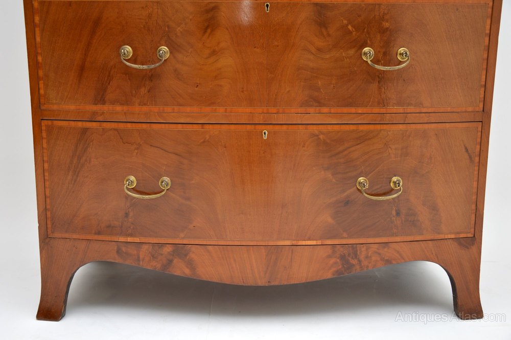 This large antique inlaid mahogany bow fronted chest of drawers is a top quality item of antique furniture, totally original & Edwardian Sheraton style.