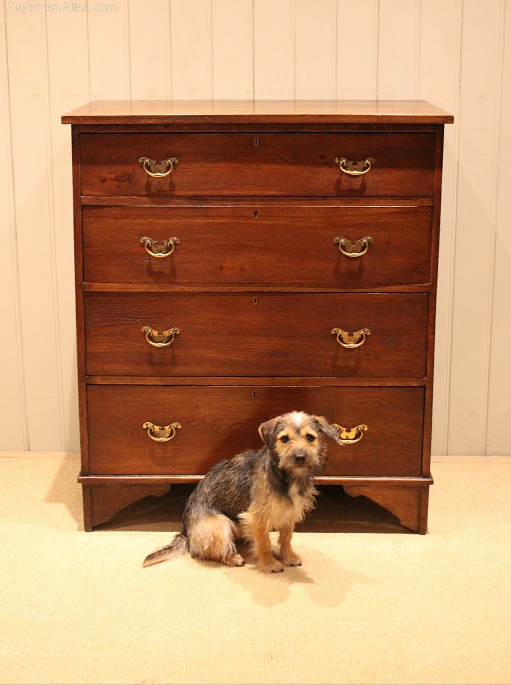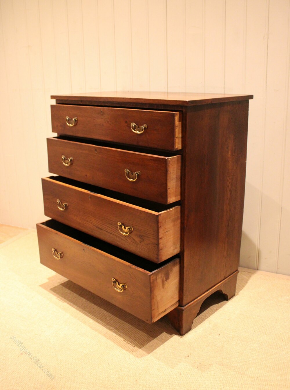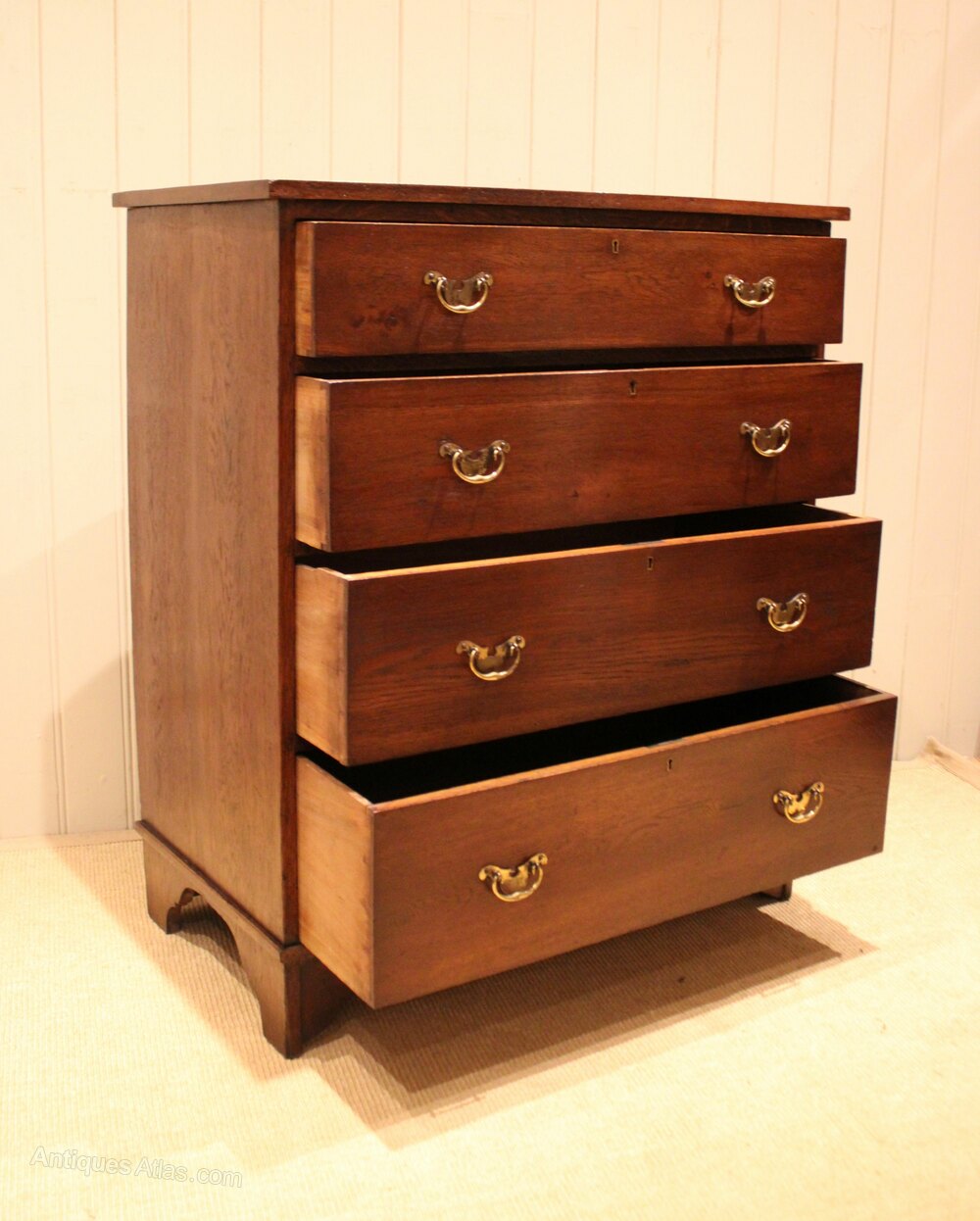 Large oak chest of four drawers with brass handles , raised on bracket feet . The drawer depths are from the bottom up 22 cm deep , 19.5 cm deep , 17.5 cm deep and at the top 13 cm deep .