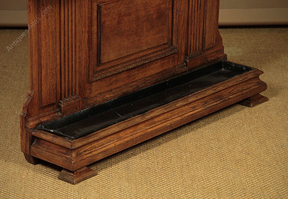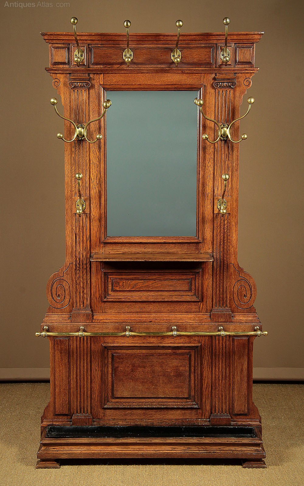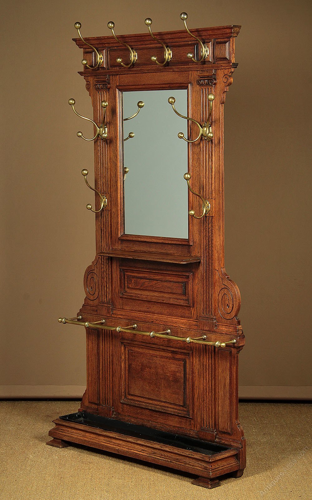 Impressive late 19th.c. oak hall stand c.1890. Ten large brass hooks with ball ends for hats and coats arranged around a central mirror with a small shelf below. Over a brass rail with dividers to hold sticks and umbrellas etc with a removable metal drip tray in the base. Solid oak frame with a large moulded cornice, splendid fluted faux columns and scroll carvings. Moulded plinth and feet. Excellent colour and condition, cleaned and waxed in our workshops.