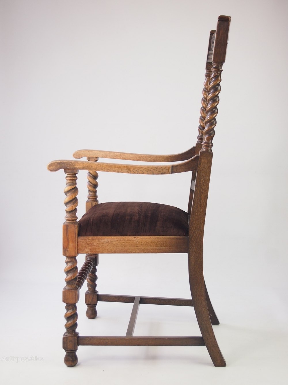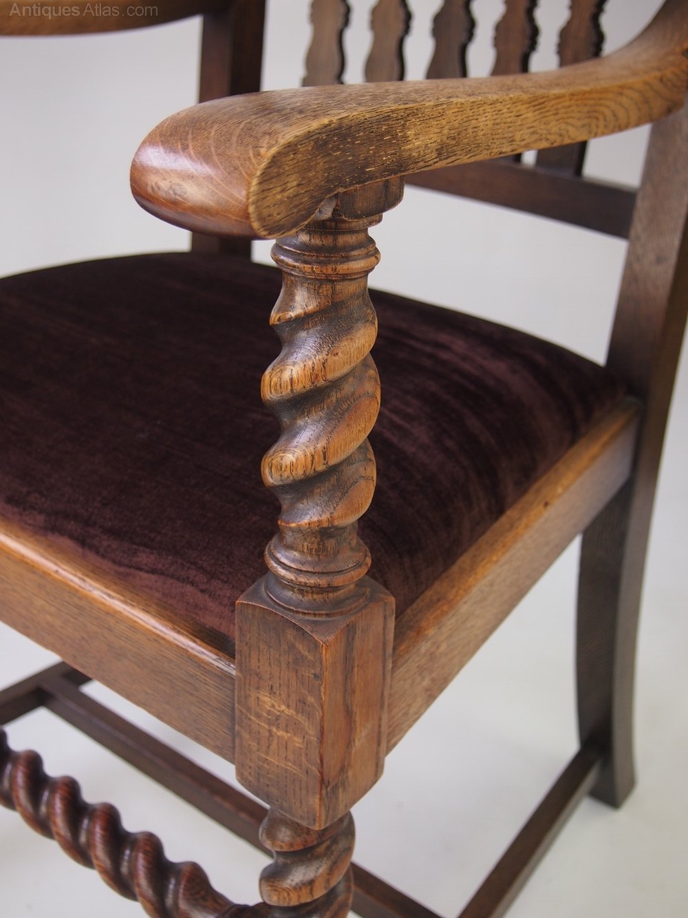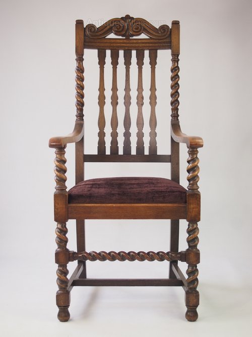 A handsome vintage high back open armchair / desk chair in oak with barley twist legs dating from circa 1930s. The chair is in a lovely figured oak with carved top rail above shaped back splats with barley twist side supports. The arm supports, legs and front stretchers are also barley twist and the drop in seat has been newly re-upholstered in a dark brown velour fabric. Good condition and very solid and sturdy.