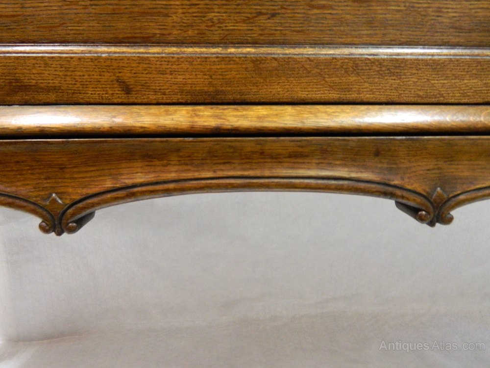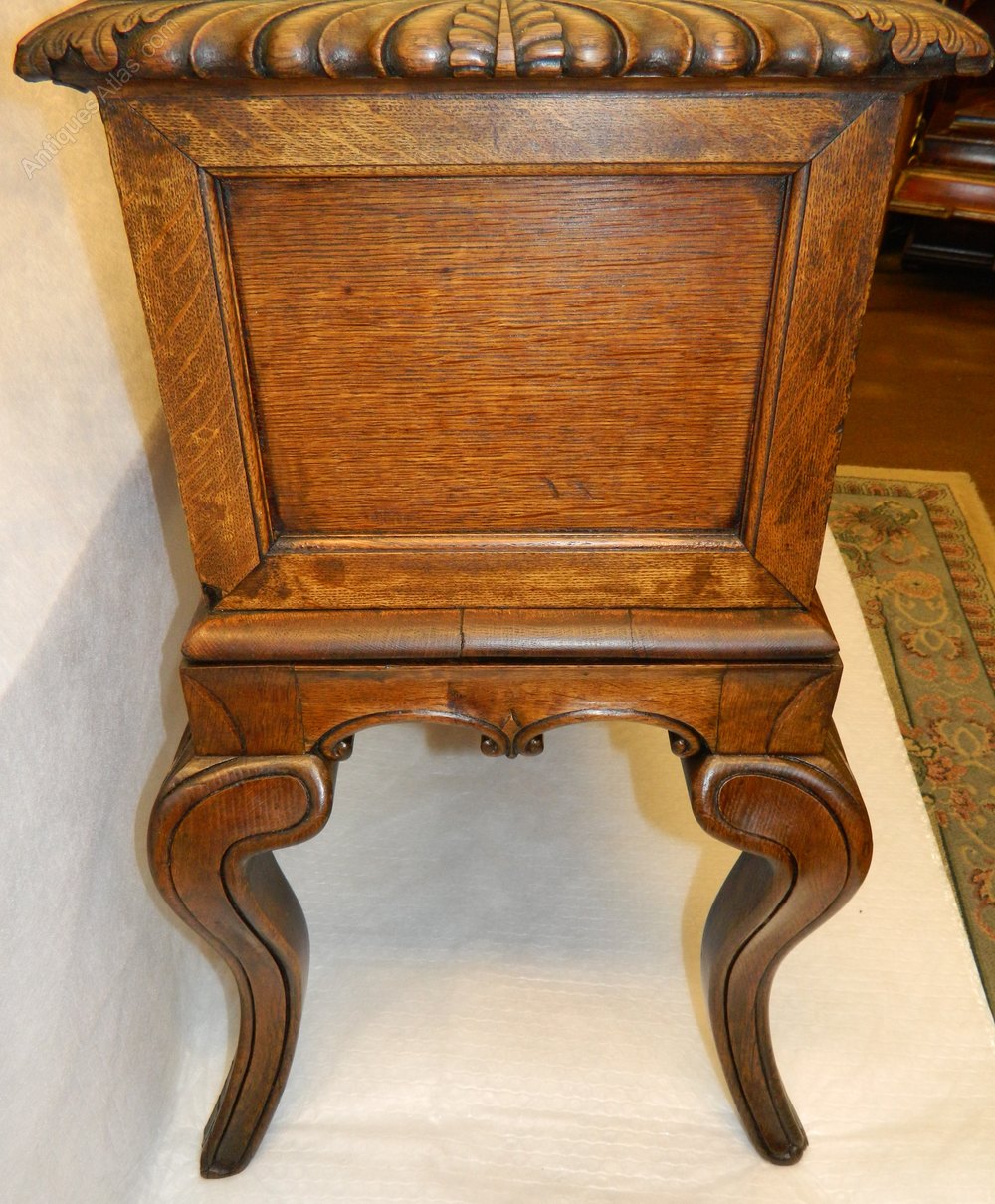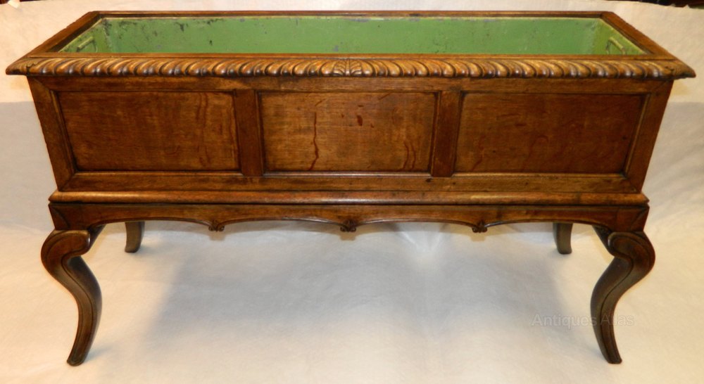 good quality large oak planter with lift out metal liner, the top with decorative carved edges, panelled front and sides standing on base with shaped apron and cabriole legs.