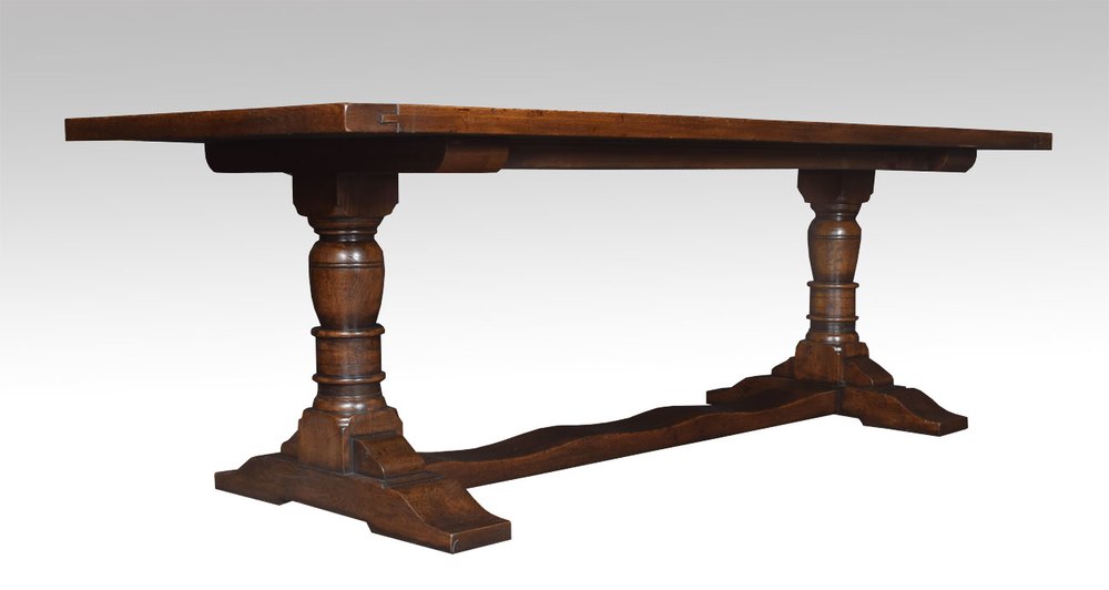 Large oak refectory dining table the architectural rectangular four plank top, above two turned tapering supports leading down to block feet united by stretchers (will comfortably seat 10)