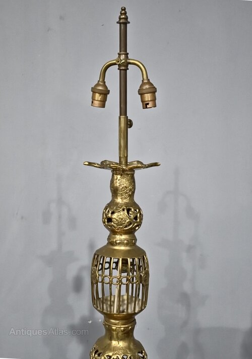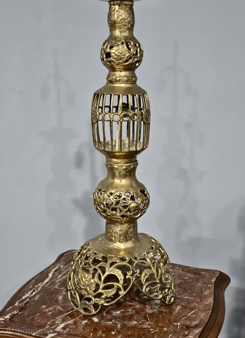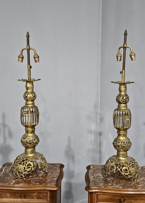 Good pair French pierced brass candlesticks,doublenbulb holders, in overall very good condition.