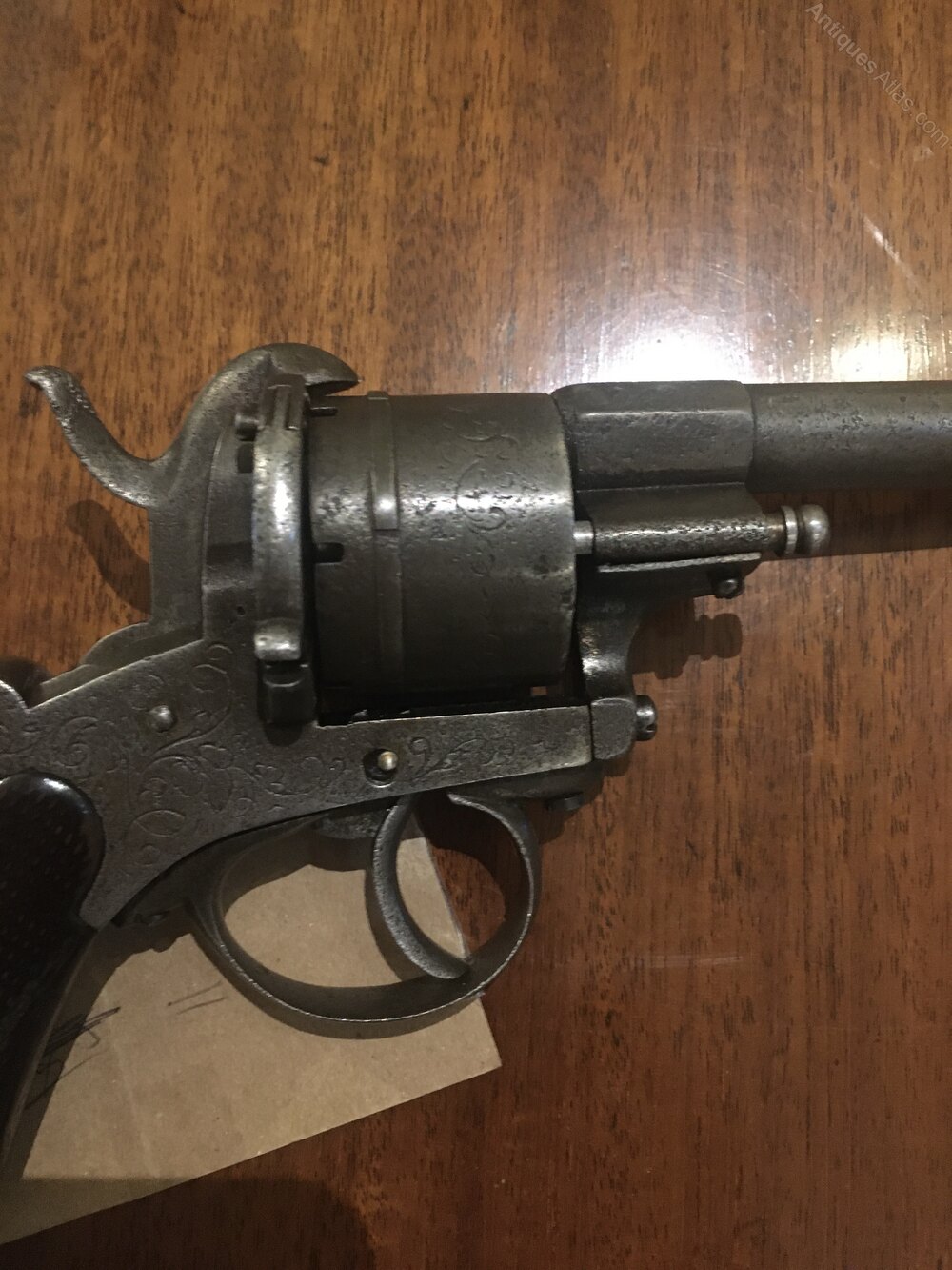 A very large pin fire revolver “ 28 cm overall “ 11 mm Lefaucheux Belgian proofed 6 shot pin fire . Some engraving to the frame cylinder and trigger guard military style lanyard ring. Good solid military style pistol of exceptional size . Loading gate works fine works on double action ie on the trigger.
