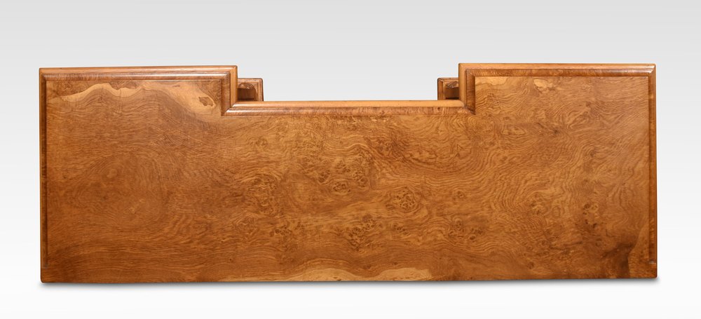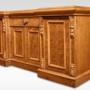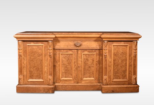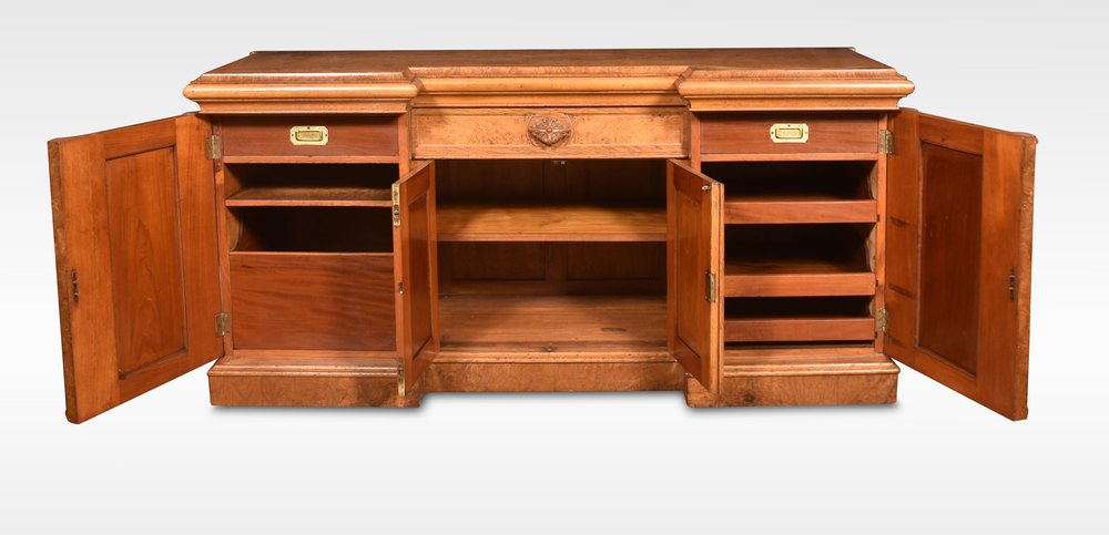 Large sideboard the large inverted breakfront top with moulded edge to the central freeze drawer with carved handle. Above four well figured doors opening to reveal fitted interior of shelves and drawers. All raised up on plinth base.