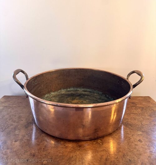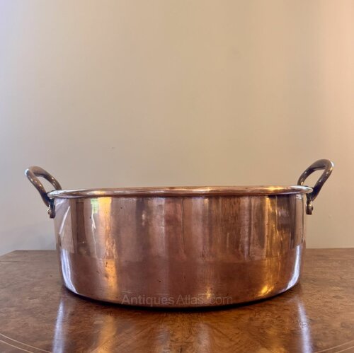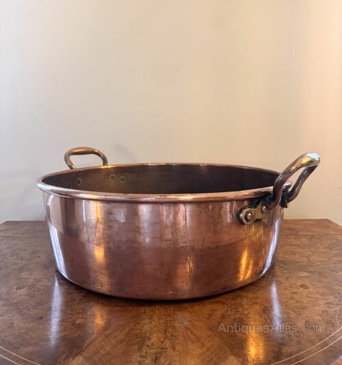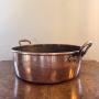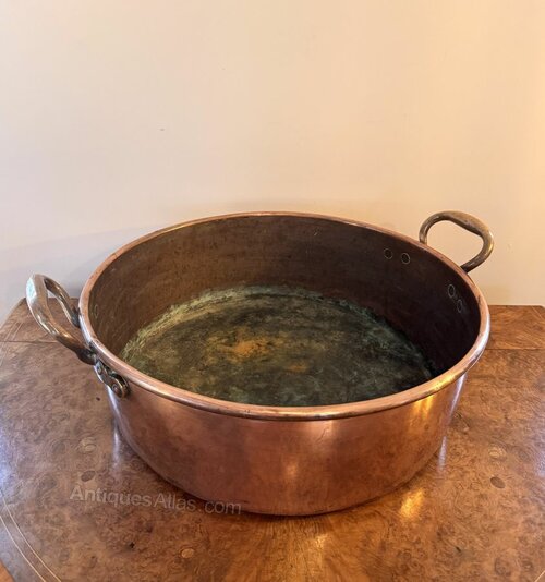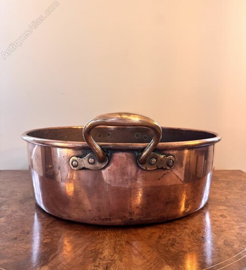 Large quality antique George III copper pan, having a quality large antique George III copper pan with shaped carrying handles to both sides.