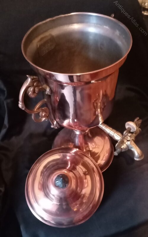This Large SAMOVAR is quite resplendent. Metal Label inside but I could not make it out! It is COPPER with a Metal Finial & Copper Handles, A Brass Tap and Measures 52cm in height on a Base measuring 19cm. I thought that Lise looks somewhat like a Trophy and would act as such for a Club, be it Tennis, Bowls or Golf! (My thoughts!)
