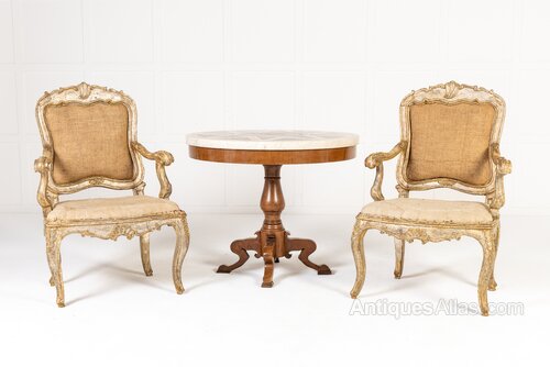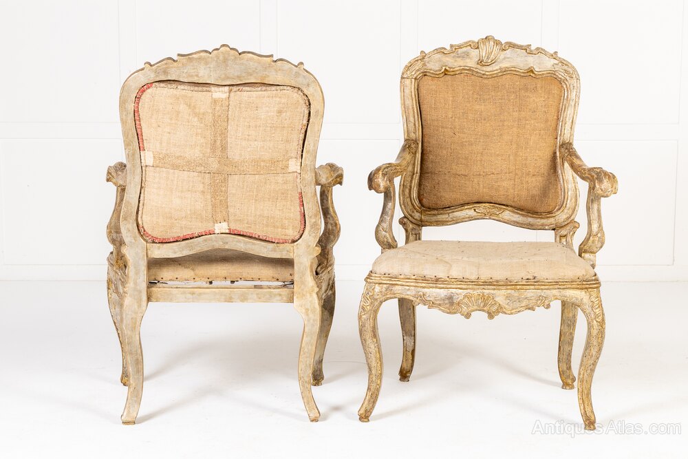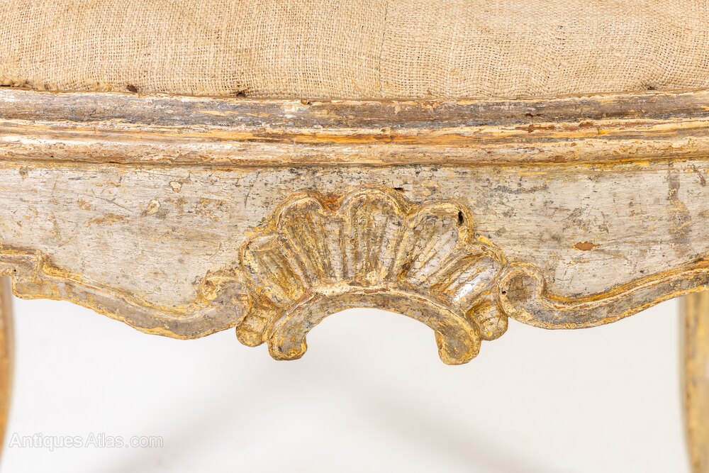 These grand armchairs, of large scale, retain their original silvered and gilt finish, a speciality of Italian makers during this period. The decoration of the chairs is in the restrained rococo manner with cabriole legs, carved shell detailing and hints of asymmetry on the crestings. The arm supports have scrolled ends and the chairs stand beautifully.