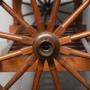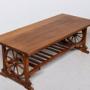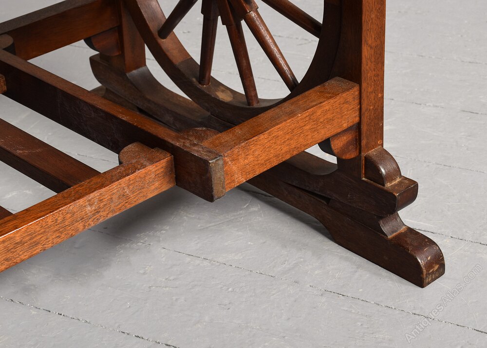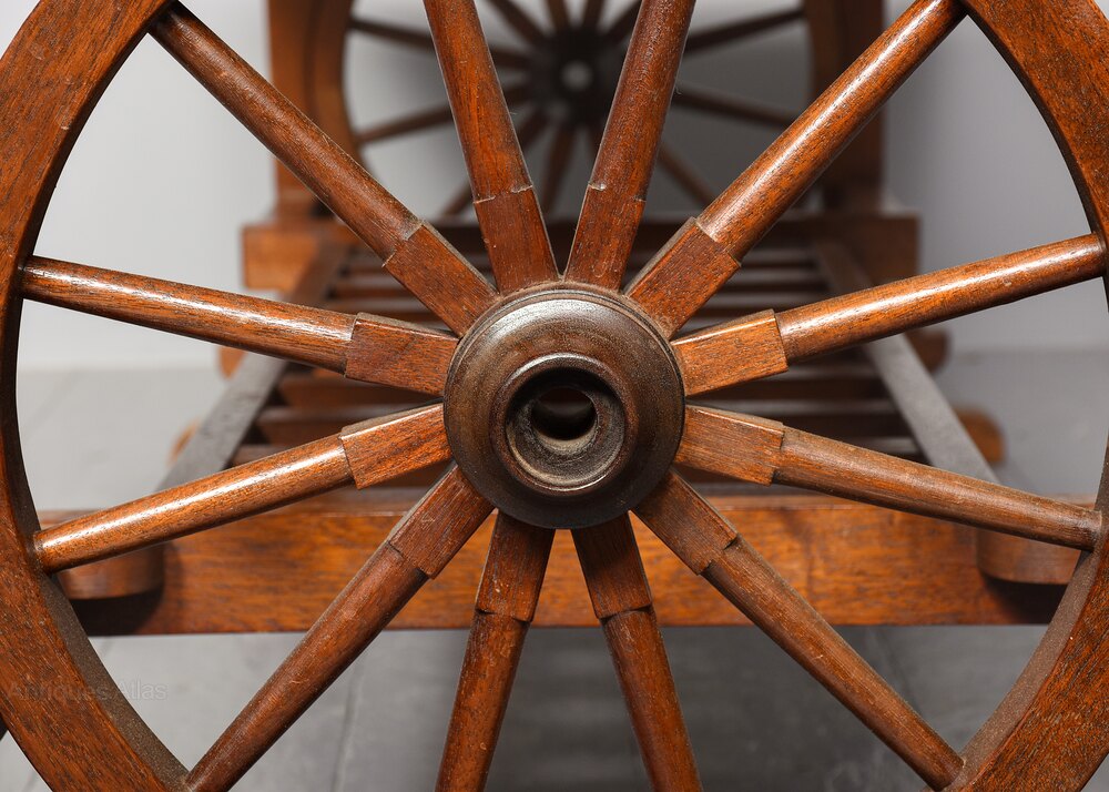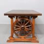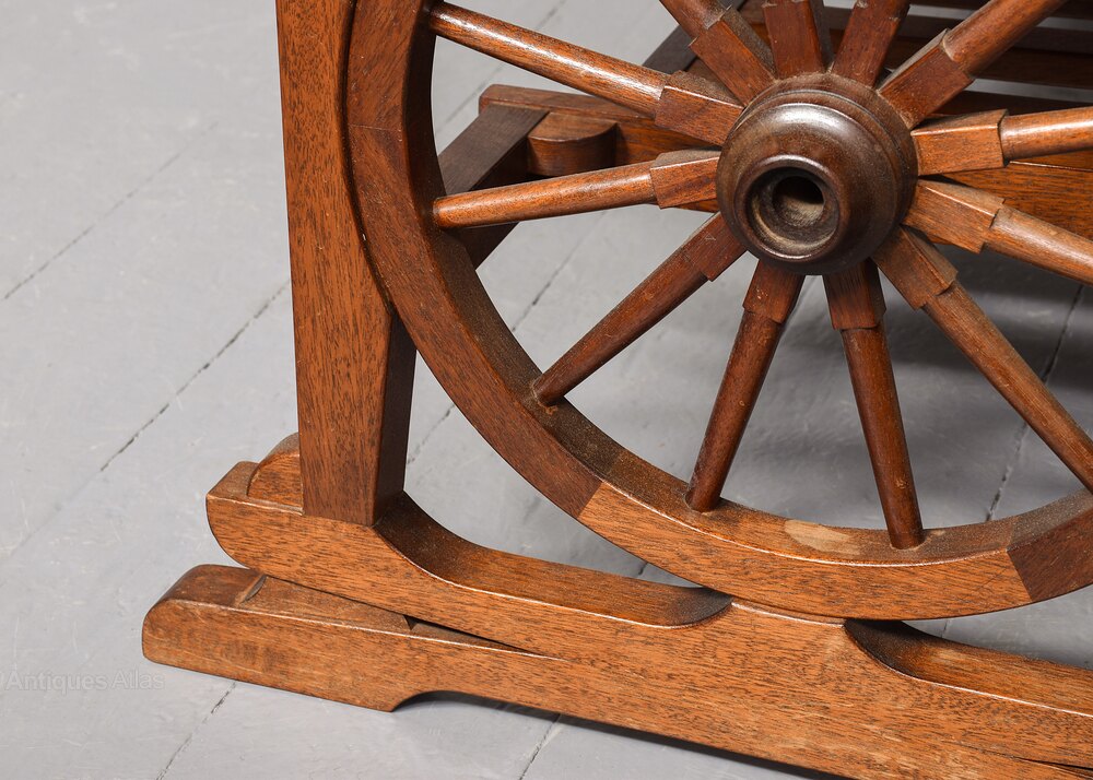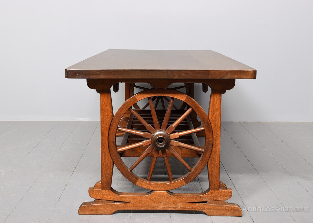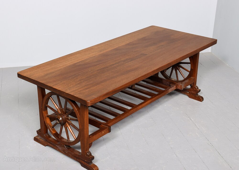 Circa 1970s. Unusual, stylish mahogany coffee table, the large rectangular top with rounded corners and simple fore edge with downward facing finials, supported with a base which includes two spoked wagon wheels in a mahogany frame, braced by a slatted stretcher, resting on a simple low trestle base.