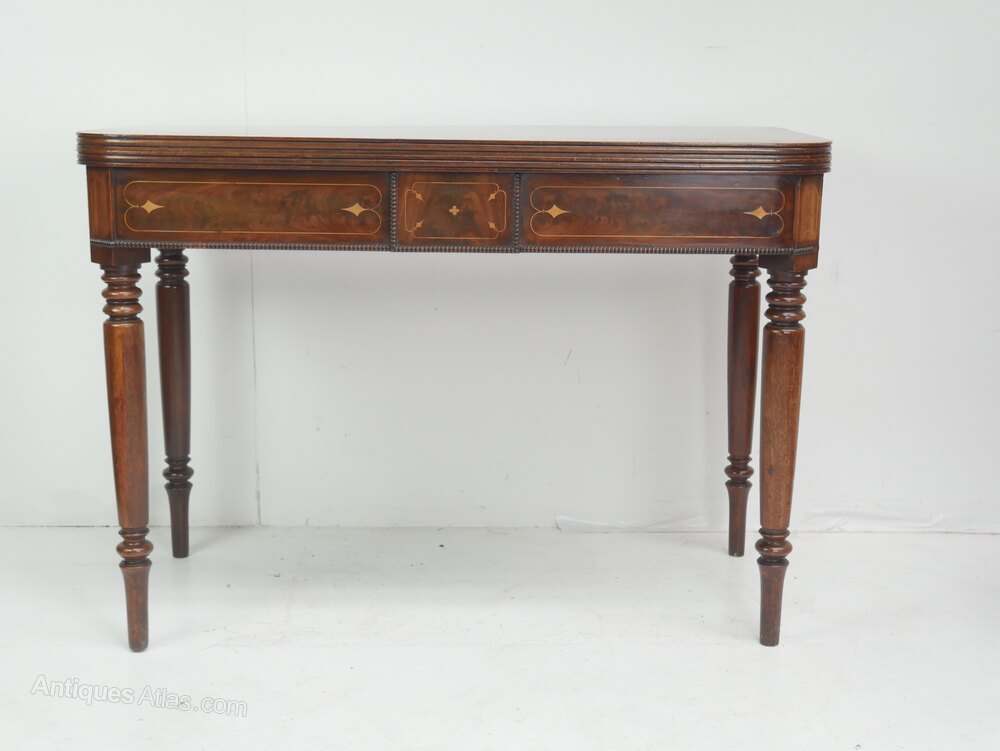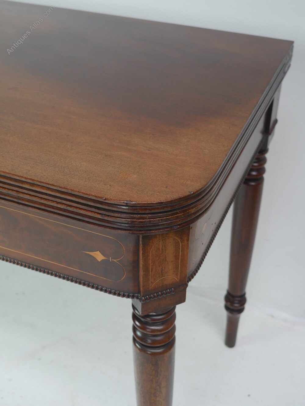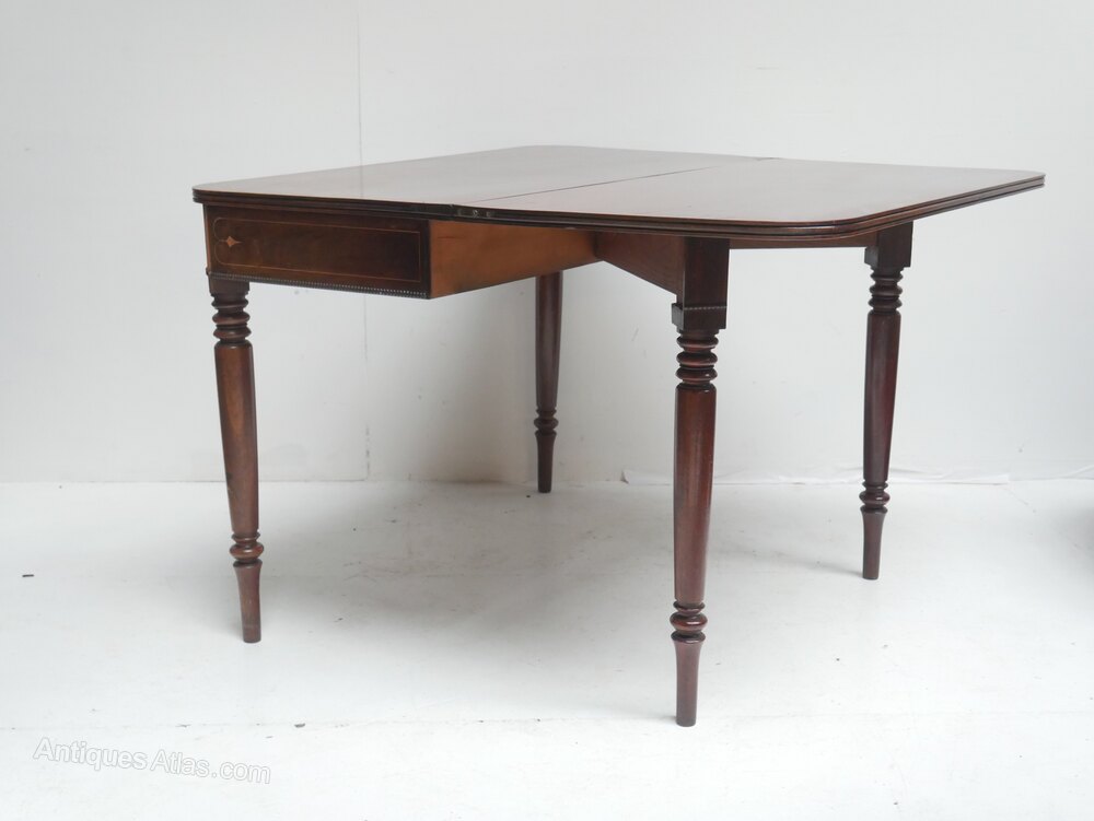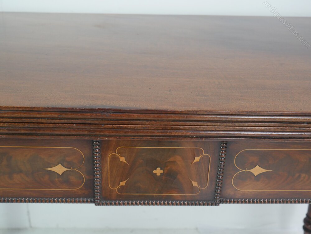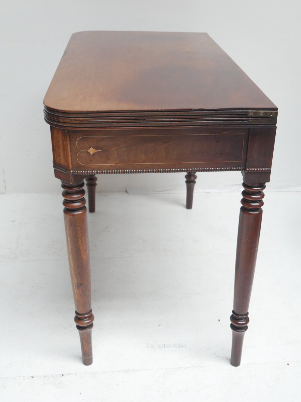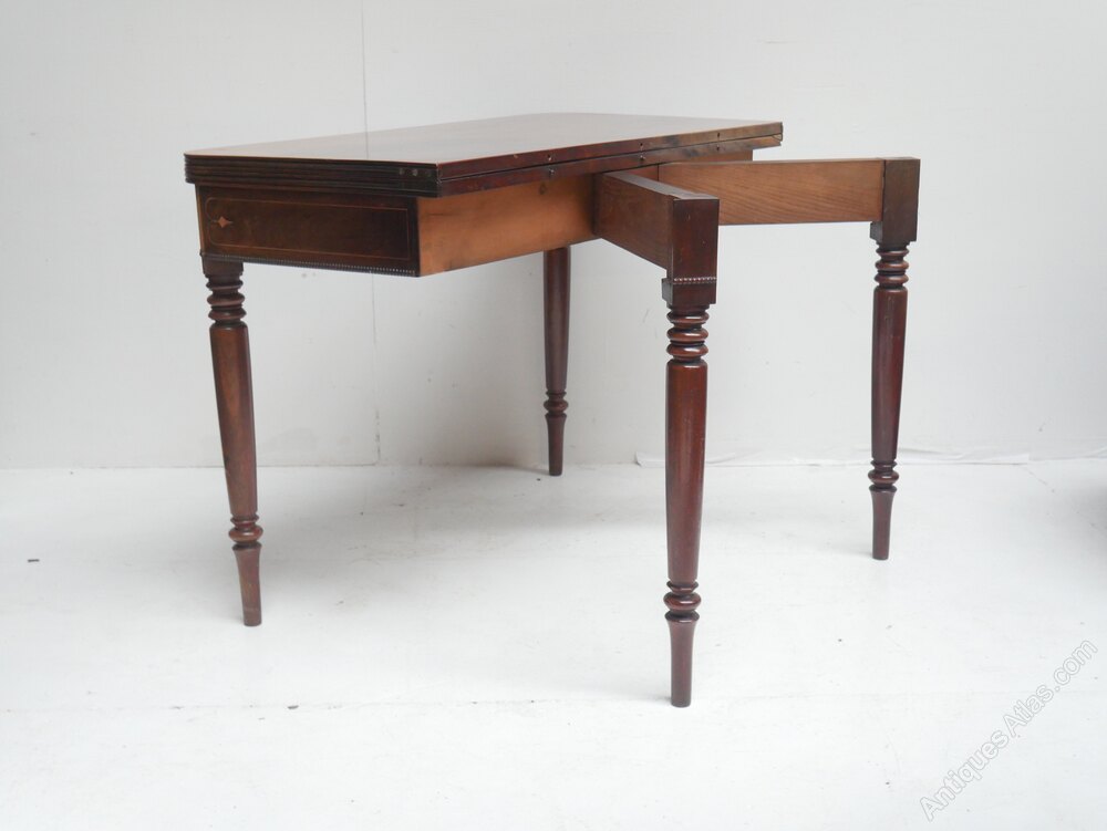 A good quality early 19th century brass inlaid mahogany side table, with a turn over top, opening to a four seater table. The table stands on turned mahogany legs, all in good strong condition, made around 1830, size open 105cm all ready for use.