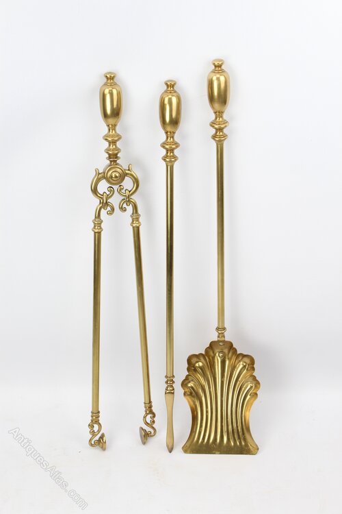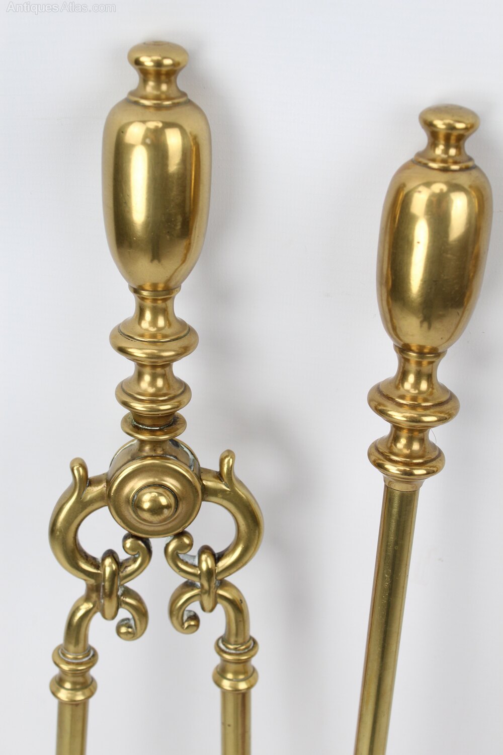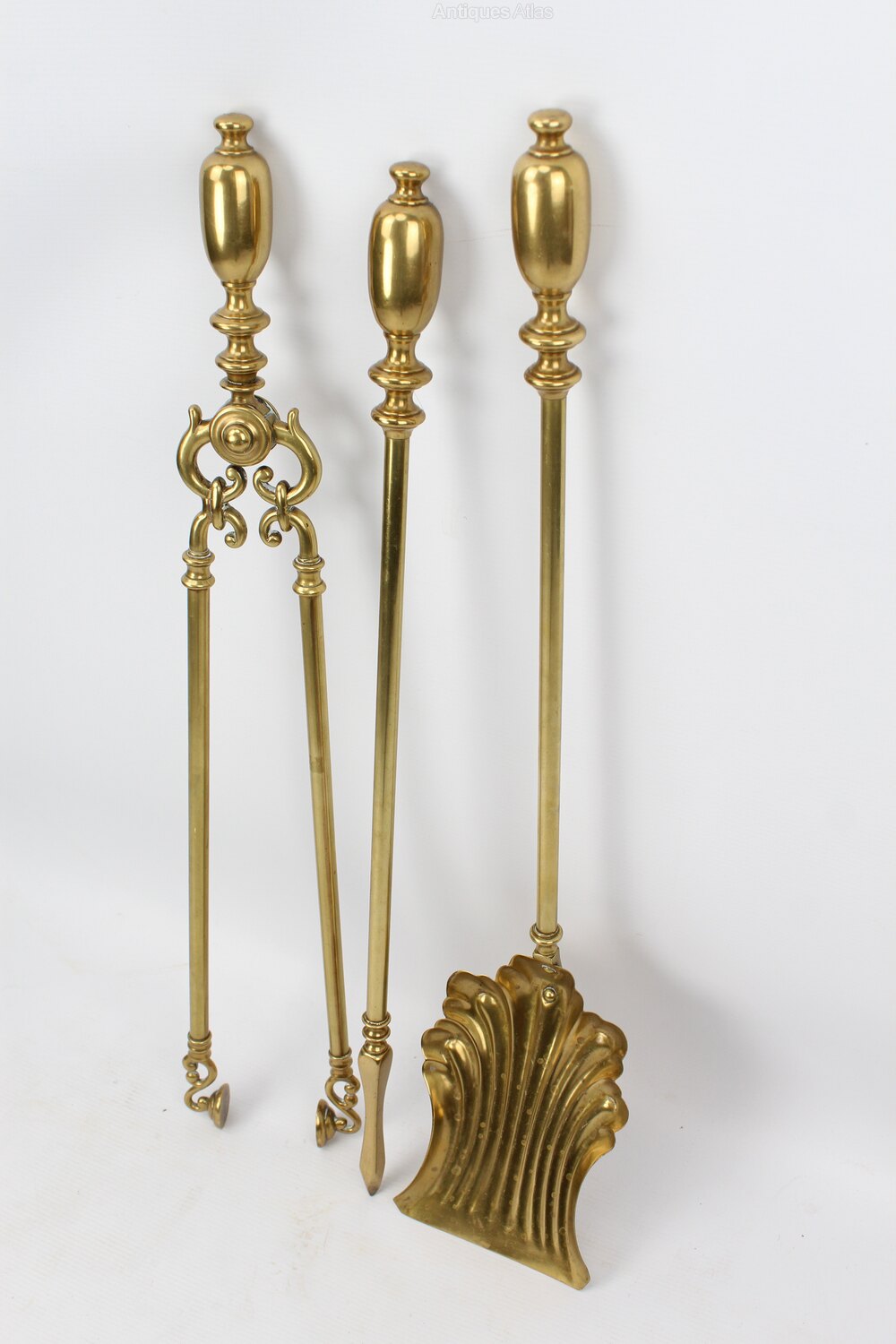 A magnificent set of large antique Victorian brass fire irons or fire tools dating from circa 1890. Comprising a pair of tongs, a poker and a shovel all with fancy bulbous turned handles and attractive detailing.