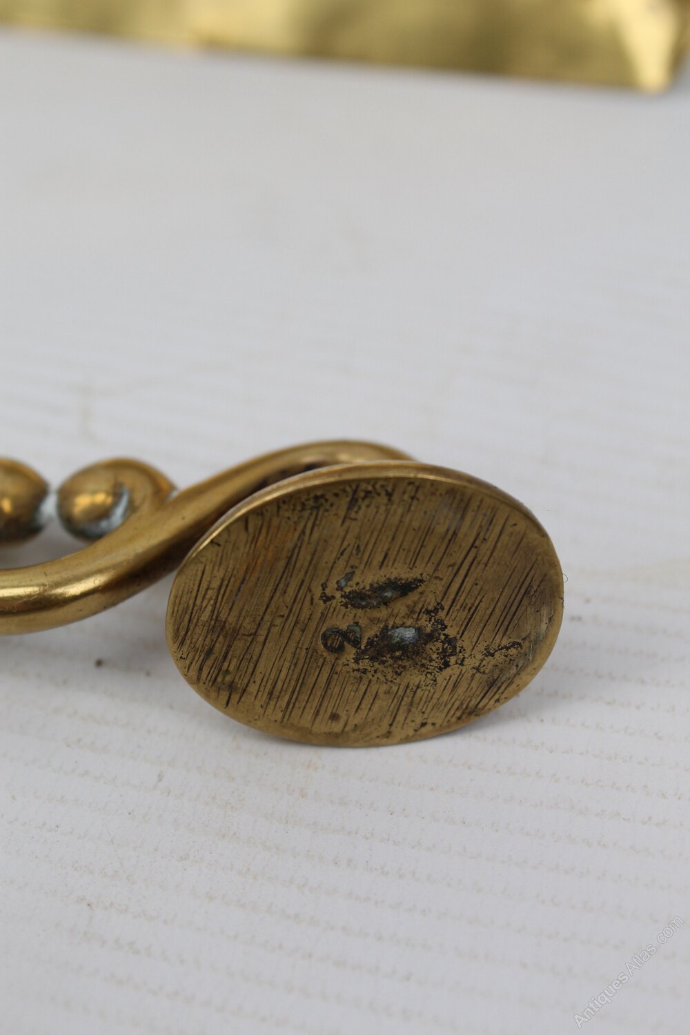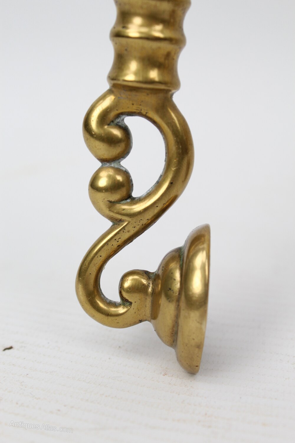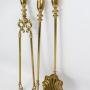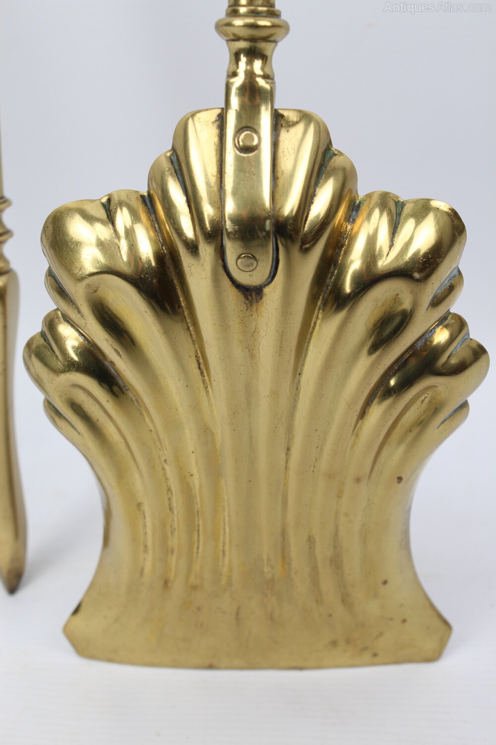 A magnificent set of large antique Victorian brass fire irons or fire tools dating from circa 1890. Comprising a pair of tongs, a poker and a shovel all with fancy bulbous turned handles and attractive detailing.