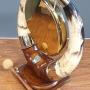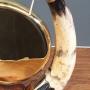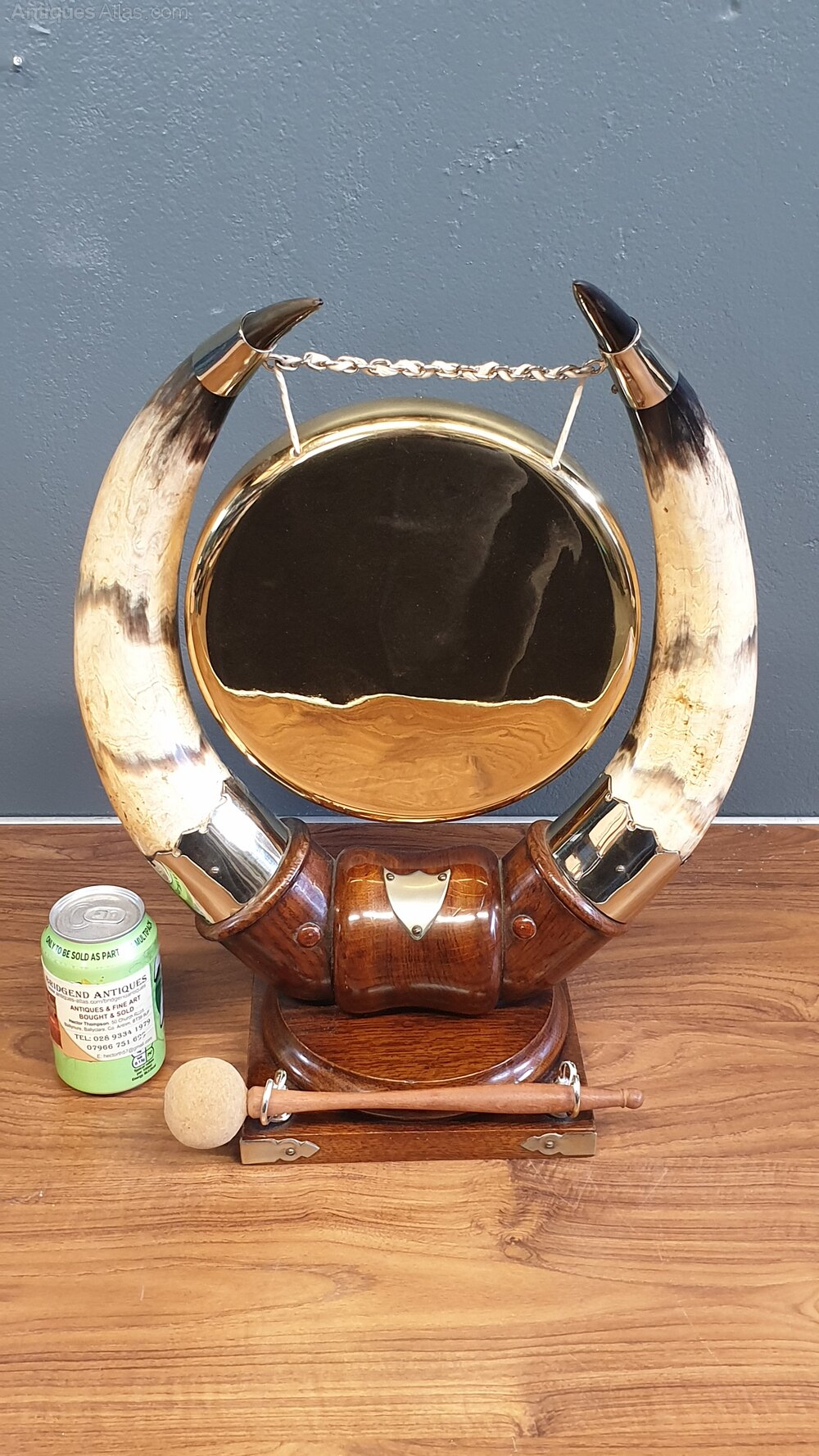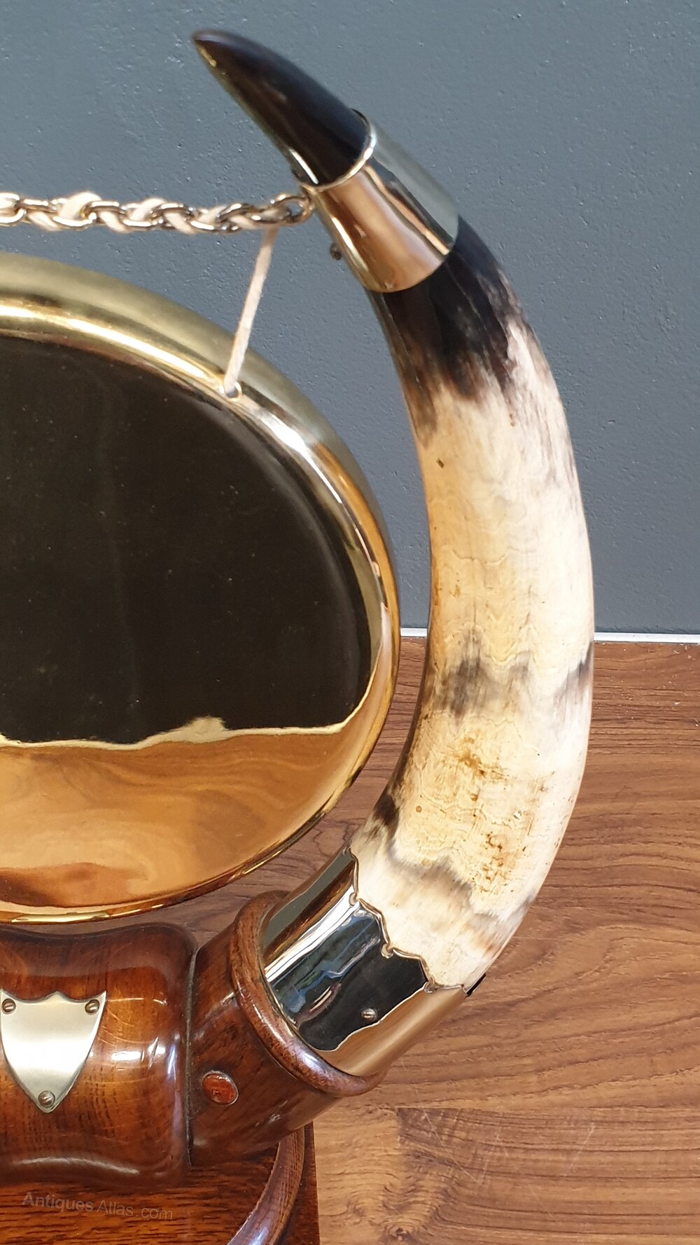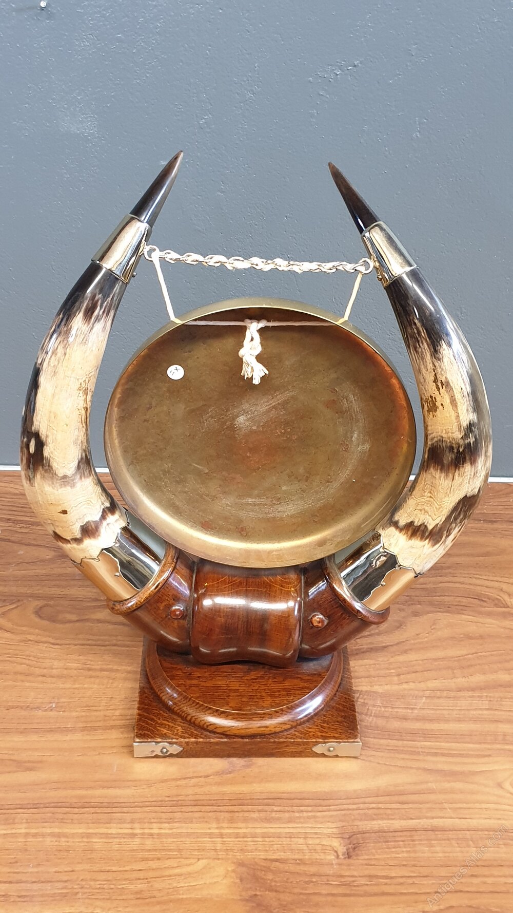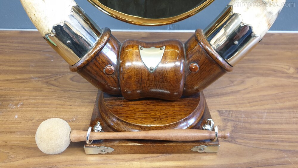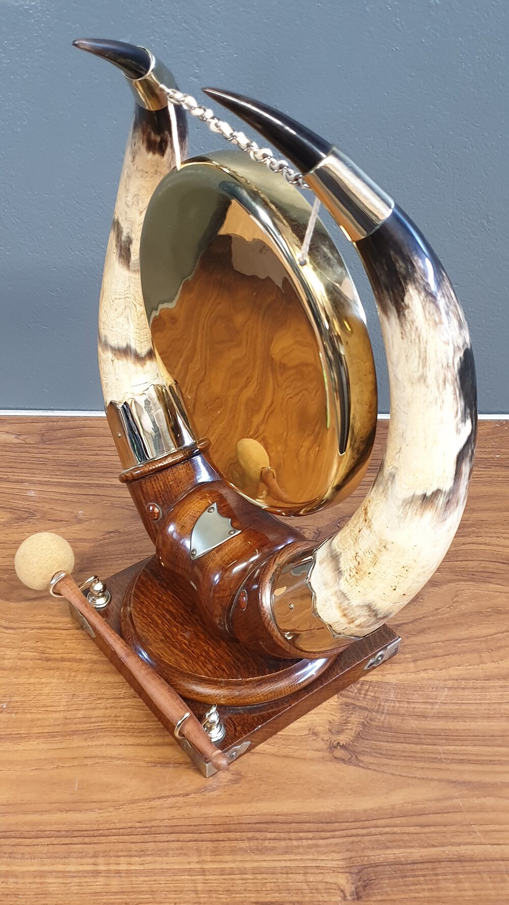 A stunning Victorian brass dinner gong suspended between two large cattle horns having silver plate mounts & comes with hammer. All supported on a oak wooden base.