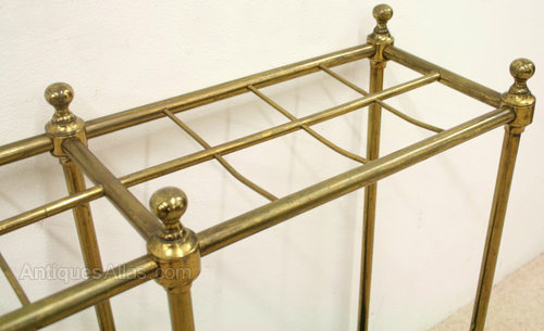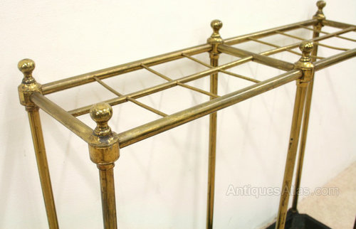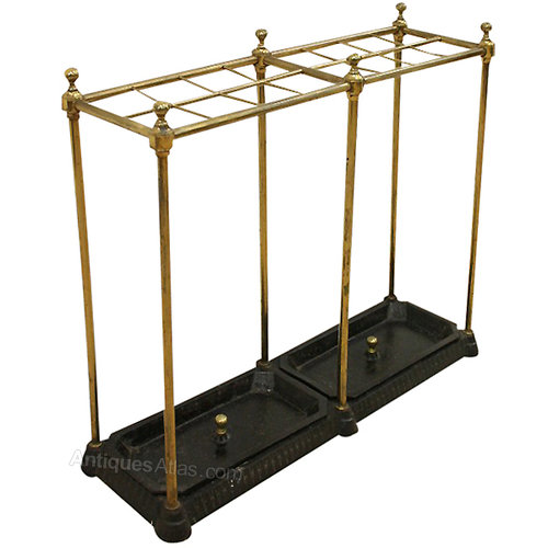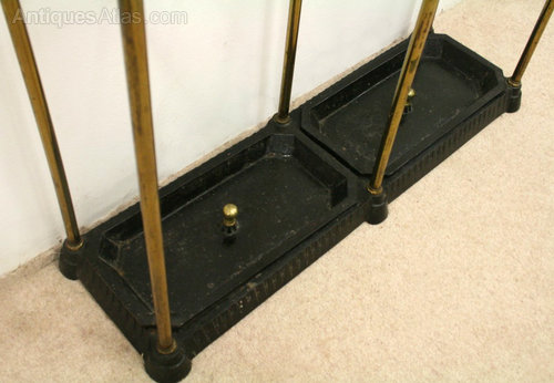 Circa 1880, large Victorian double sized stick stand with 16 divisions which are held by 6 turned upright columns, each finished with a cast brass finial. On the base are 2 cast iron trays with brass knob handles in the centre for emptying the water out. The base is cast iron base with a simple zig zag pattern. Good condition, sturdy and functional.