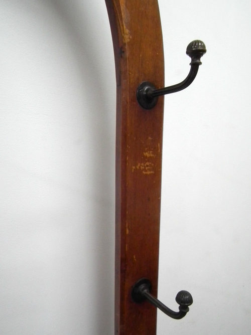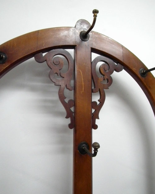 Large imposing Victorian oak hall stand which is oval in shape, retaining its original cast brass hooks. The central uprights has 2 arches coming off it, and the top arches have open fretwork brackets which give the hall stand a good presence. There are further brackets below and a cross stretcher with turned wooden handles for containing sticks and umbrellas. The substantial front rail is fluted and supported on a shaped arm, and at the bottom is a large drip tray.