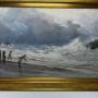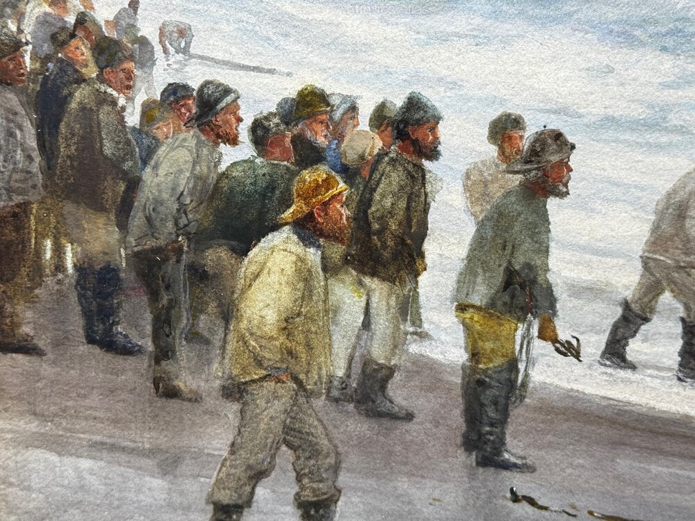 On the beach below the cliffs, a crowd of fishermen, lifeboat men and local villagers rush towards the water’s edge. Figures in sou’wester hats and work clothes brace themselves on the wet sand, hauling on heavy rope or netting that disappears into the surf. Others steady the line or point towards the wreck, while further back, women and children stand in anxious groups, shading their eyes as they watch the unfolding drama.
