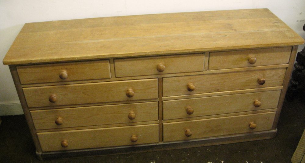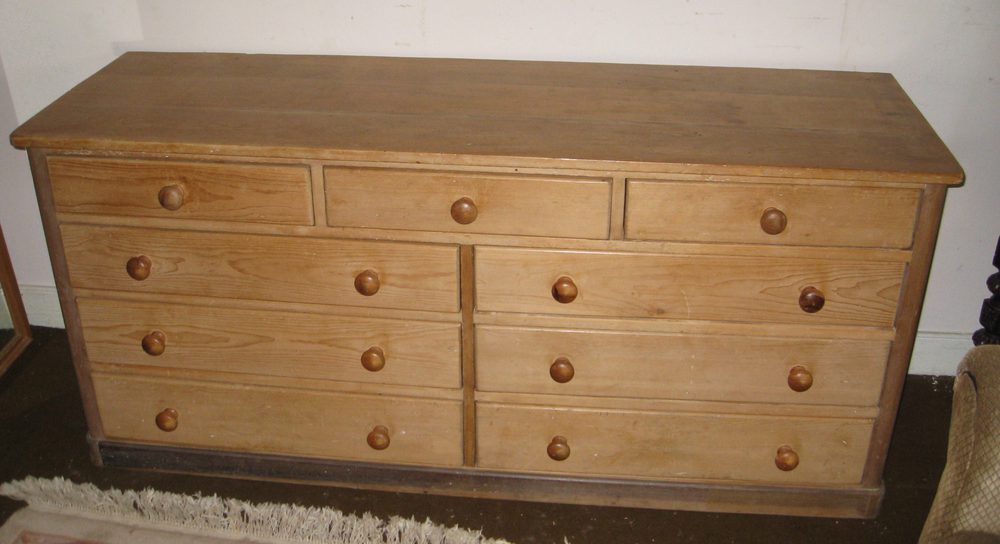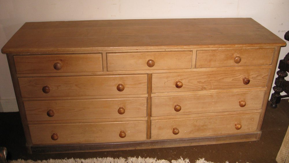 large victorian pine dresser base fitted with nine drawers, all with wooden knob handles, rounded corners and standing on a plinth base.
