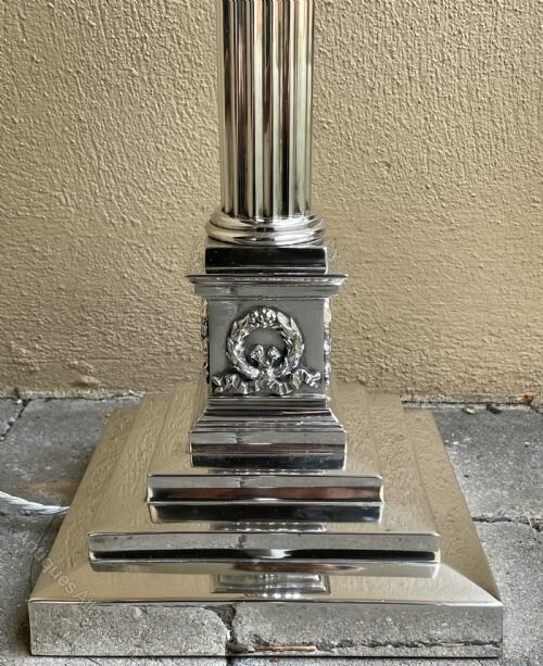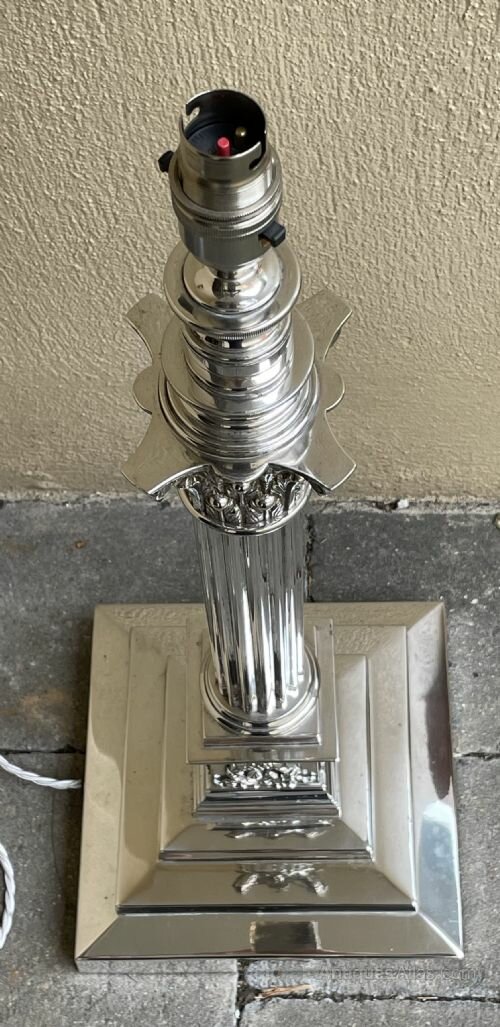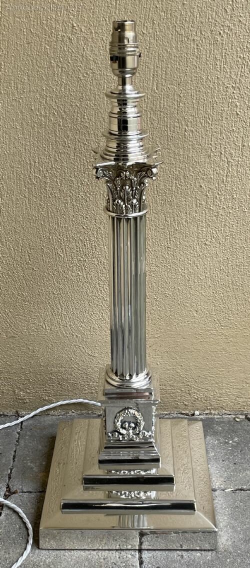 This impressive lamp with stepped base leading to Corinthian column and capital measures 60 cm in height to the top of the bulb holder. The three step base measures 21 cm x 21cm approx .