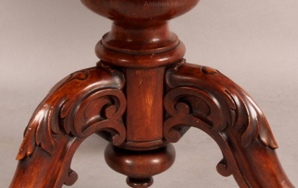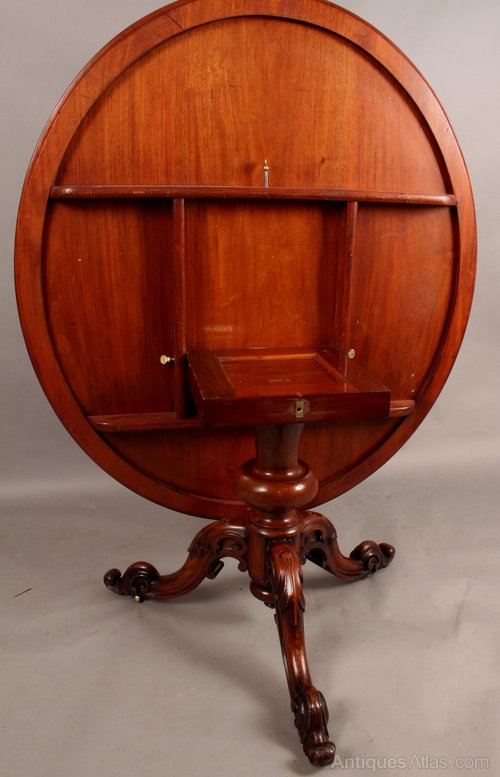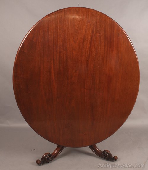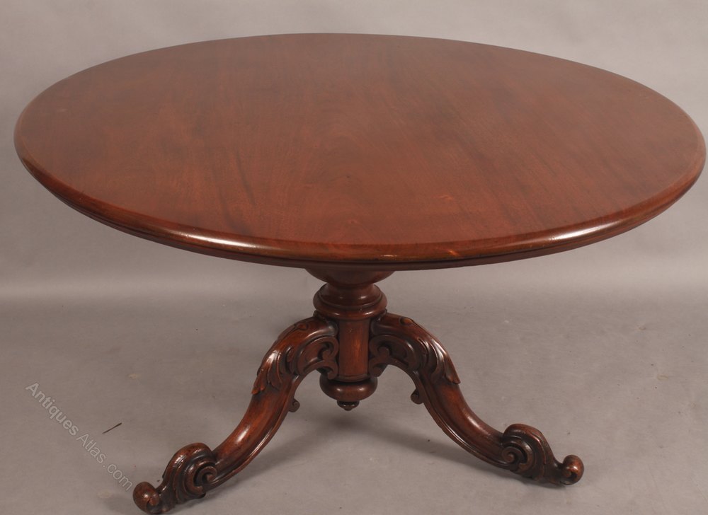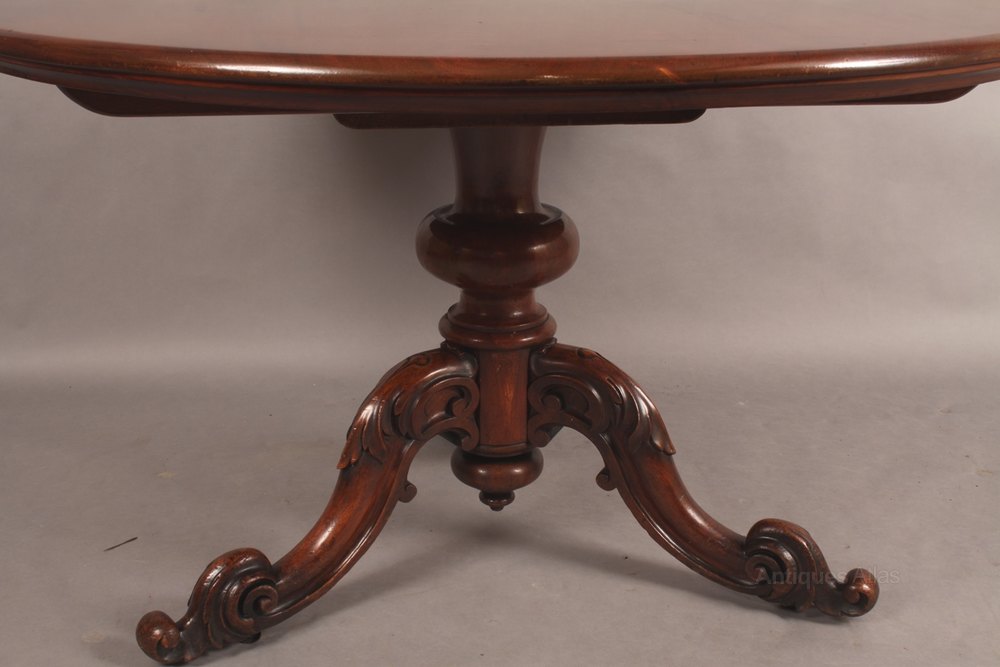 An Attractive and use full Victorian Tilt top supper table in Mahogany, the top is slightly oval in shape and is supported by a sturdy tripod base having well carved cabriole legs with castors. When not needed this table top tilts to allow it to be put to the side of the room , ie for supper or breakfast use, although it is large enough (will seat six) for dining . Excellent condition and sturdy.