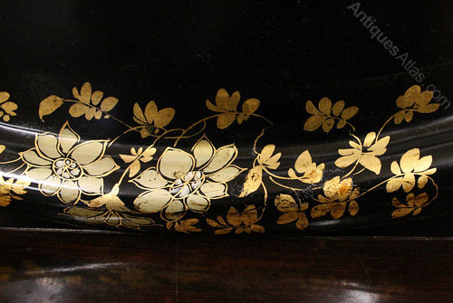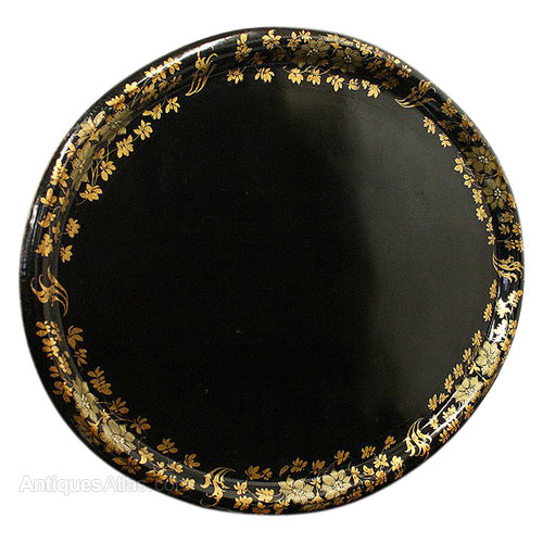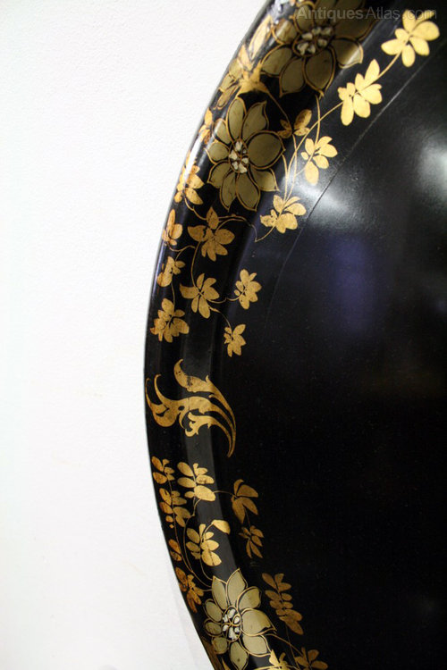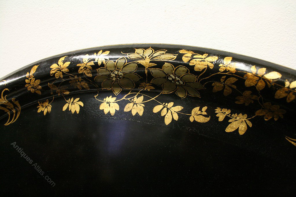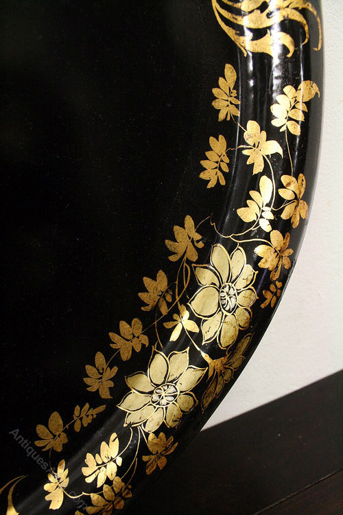 Circa 1870, large Victorian oval toleware tray, with a gilded Chinoiserie style foliate transfer around the edge. Excellent condition.