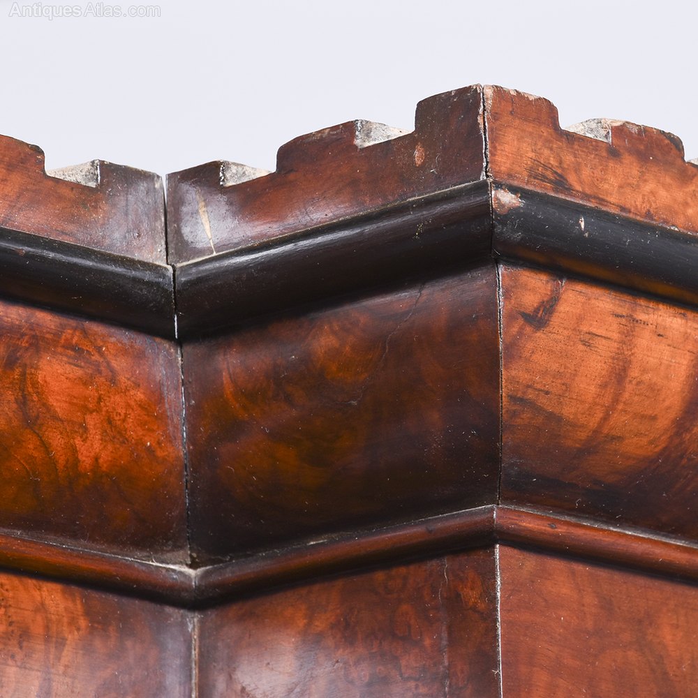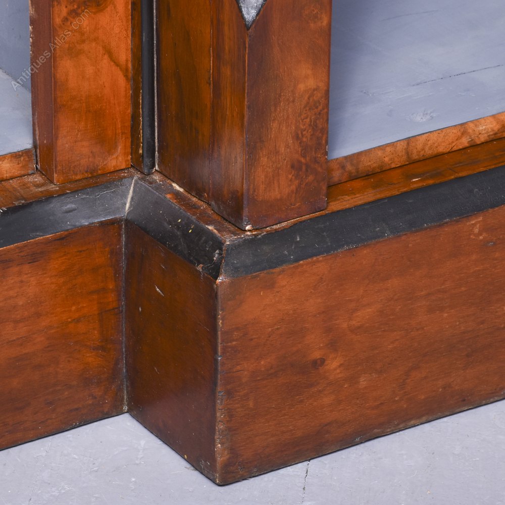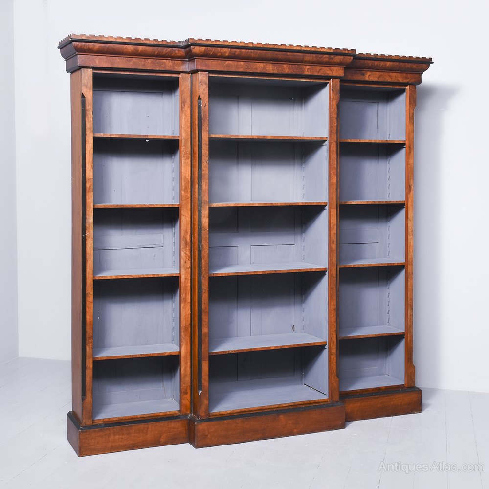 Circa 1870 with adaptations. Large Victorian walnut open bookcase with gothic influence. Surmounted by a dentil and moulded cornice and a burr walnut frieze, the three open bookcase sections, each with four adjustable shelves are flanked and divided by ebonized canted pilasters. Supported on an enclosed plinth base. In excellent condition.