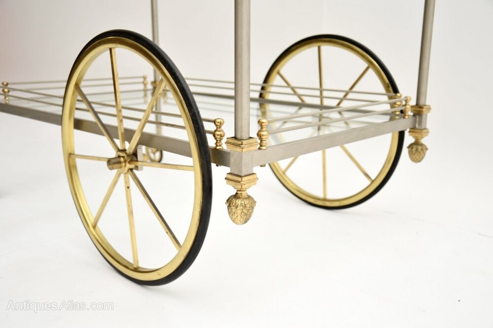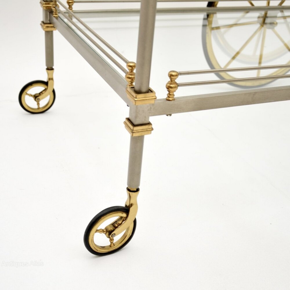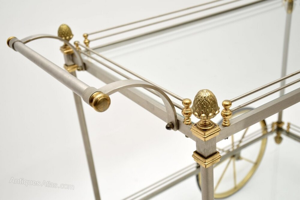 This is of exceptional quality, it is extremely finely crafted and is much larger than drinks trolleys usually seen. The brushed steel frame is complimented beautifully by the solid brass accents. There are stunning acorn finials in brass with incredibly fine details.