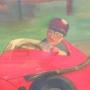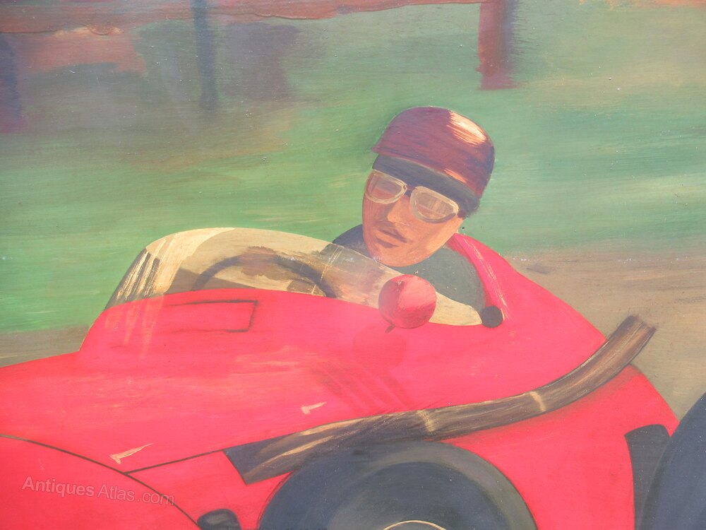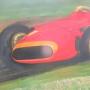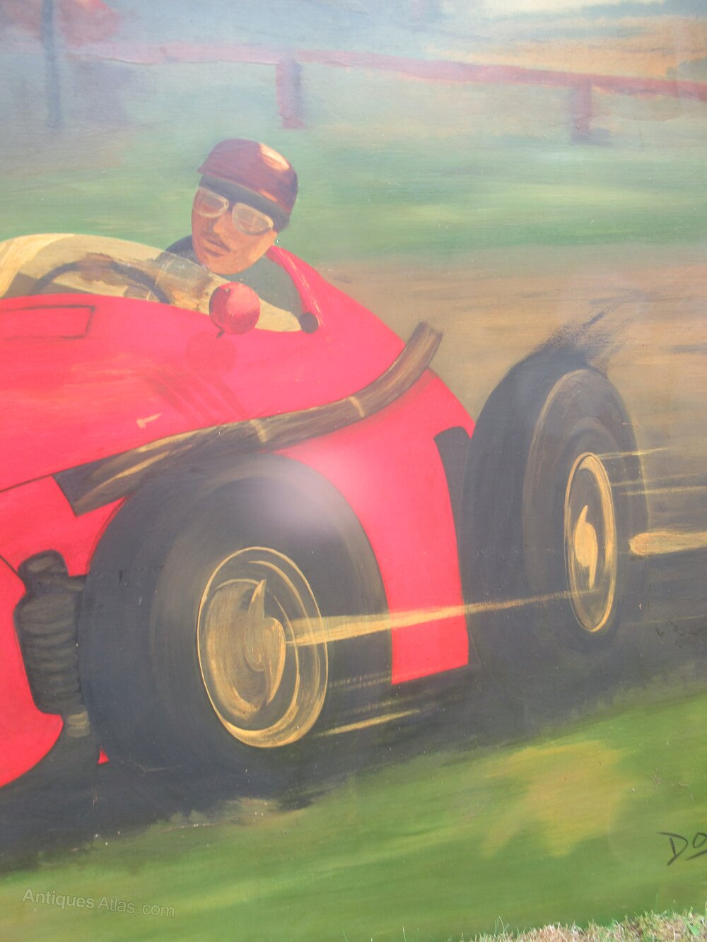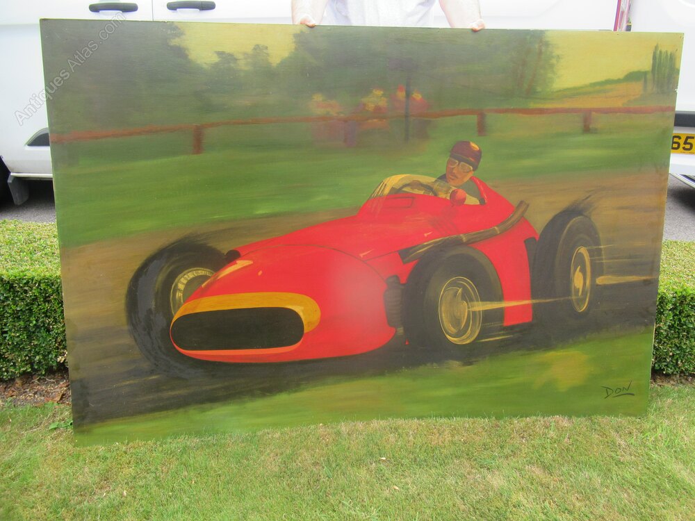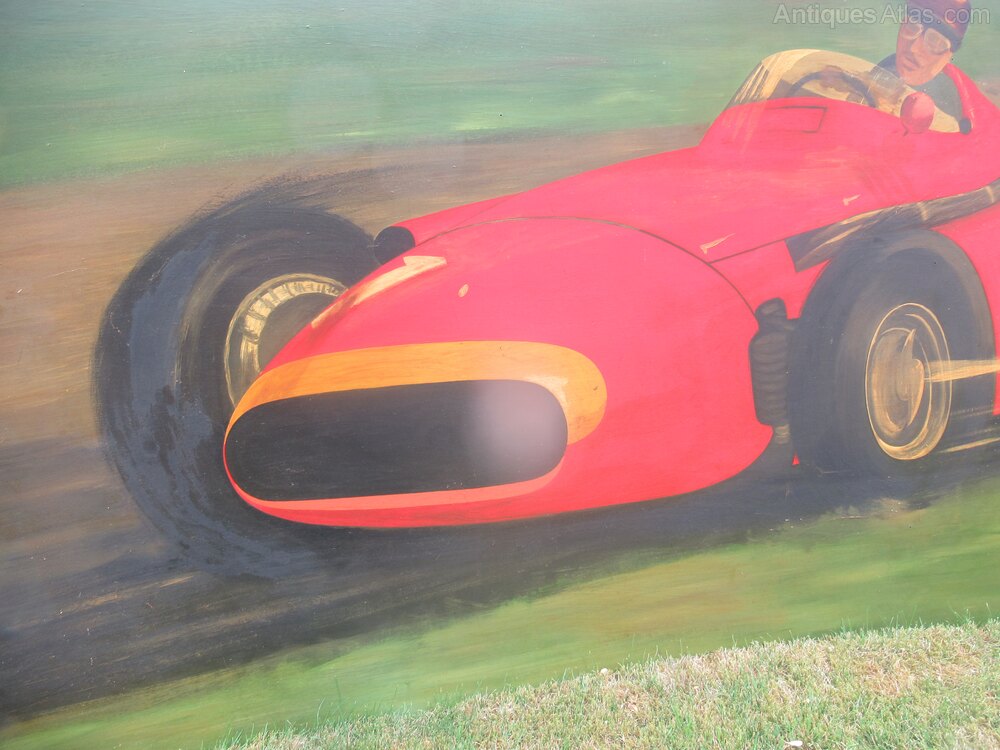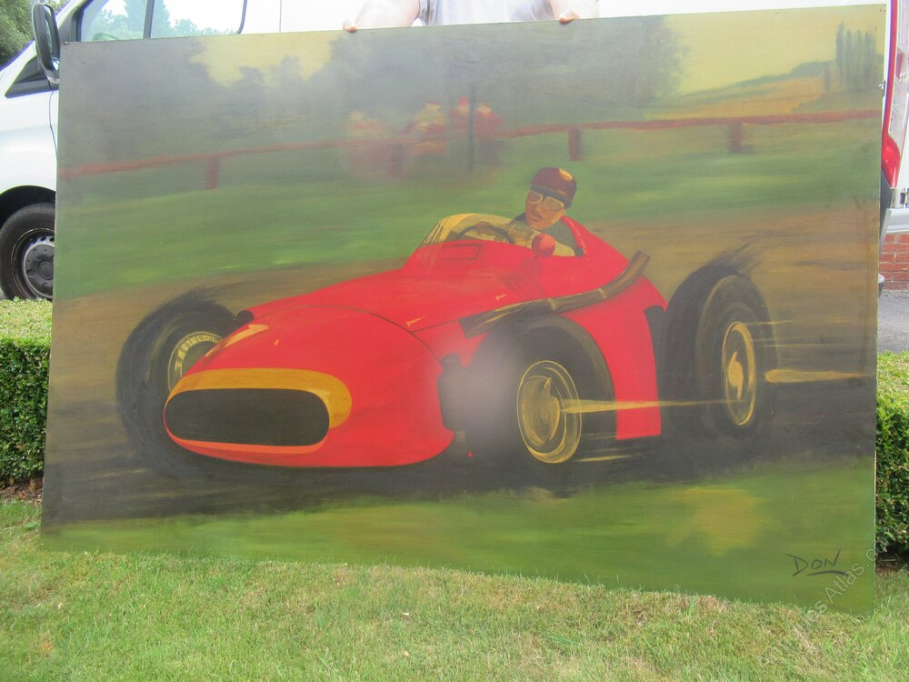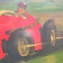 Large wall art of a racing car on board , with rear details for 1963. signed DON. The picture shows a red racing car at speed with track back ground, and in good condition.