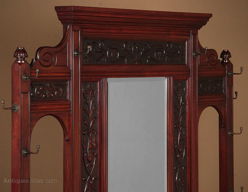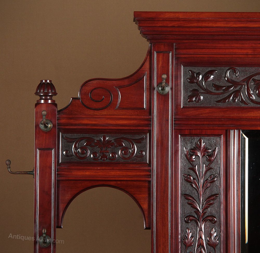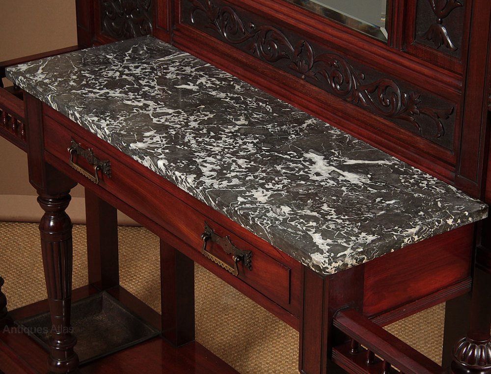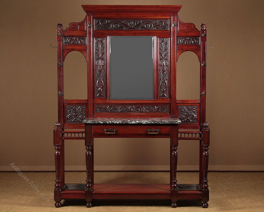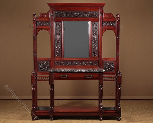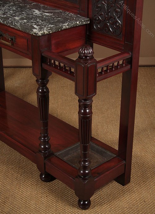 Very impressive late 19th.c. walnut hall stand c.1870. Featuring 10 original hooks for hats and coats etc, a large bevelled mirror, marble top table and single drawer. Flanked on each side with stick/umbrella stands with removable metal drip trays. Exceptional quality, in solid walnut throughout. Moulded frame with acanthus carved panels, crisp turned and reeded front legs and finials. Superb condition, original brass work, mirror, marble and trays. Cleaned and waxed in our workshops.