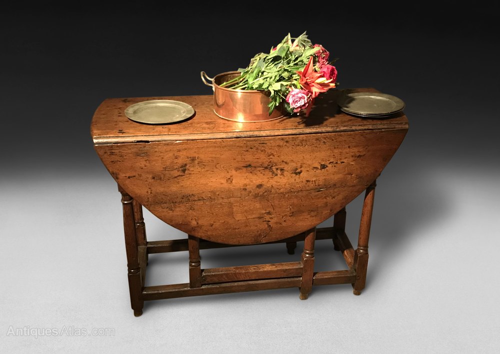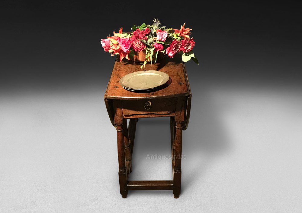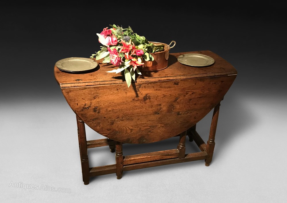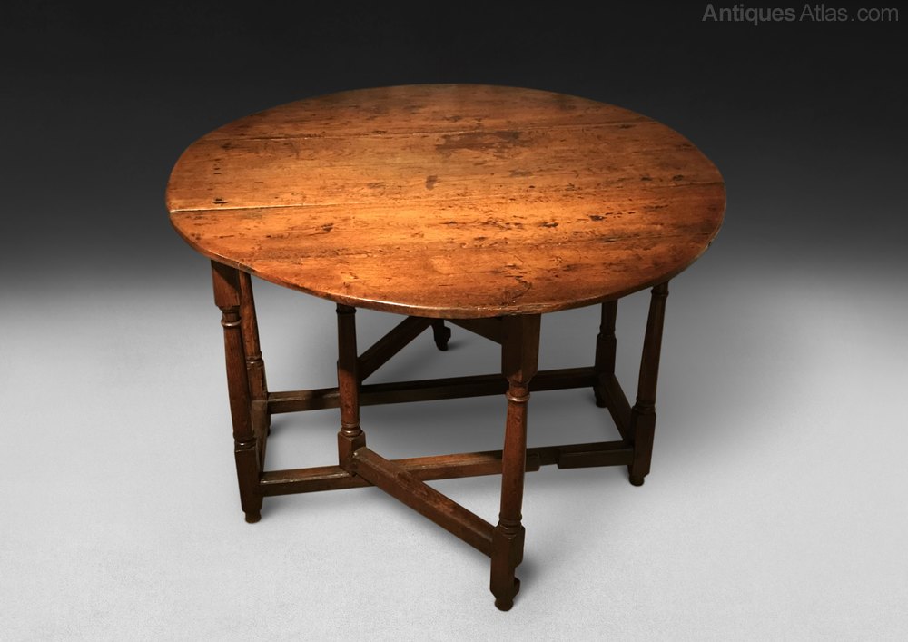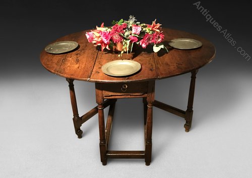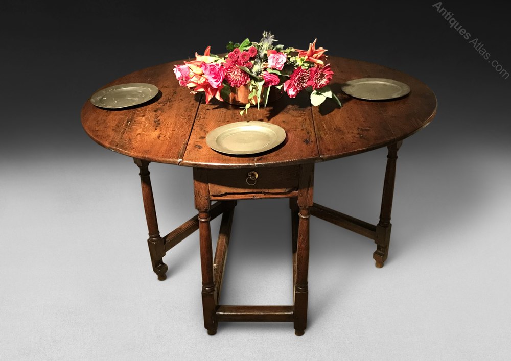 A good late 17th./early 18th. century Oak Oval Gate-Legged Table with a drawer to one end raised on six Doric Column turned supports united by a stretcher.