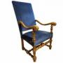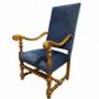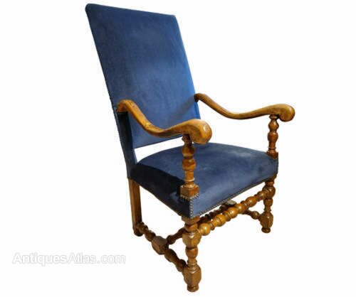 A late 19th-century walnut framed open armchair in the William & Mary style, featuring a tall, upright upholstered back and covered in a deep blue velvet. The seat and back are finished with brass nailhead trim, giving a crisp and period-inspired look.