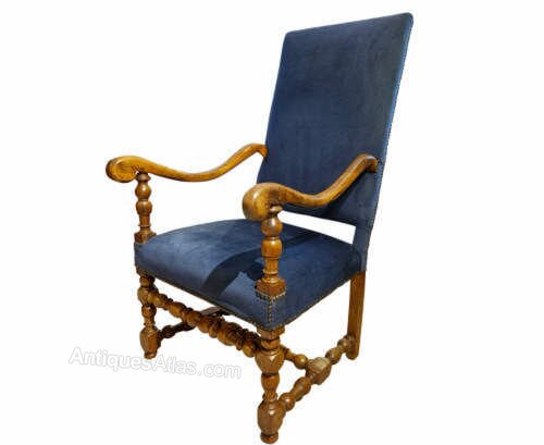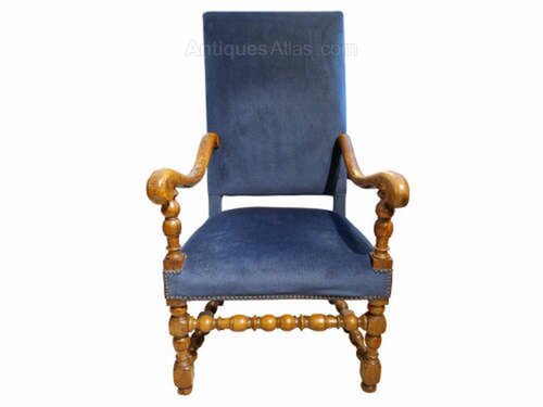 The chair displays well-shaped scroll arms on turned supports, above a boldly executed baluster-turned stretcher arrangement typical of the 17th-century revival style. Standing on block and turned legs, the walnut frame has a warm, mellow colour with attractive figuring to the arms.