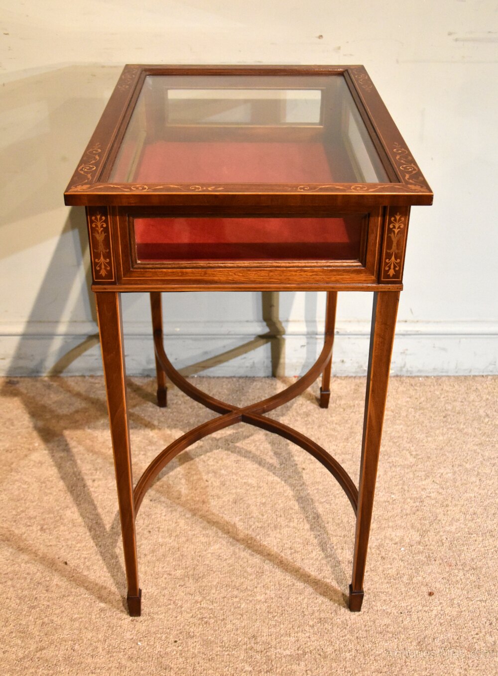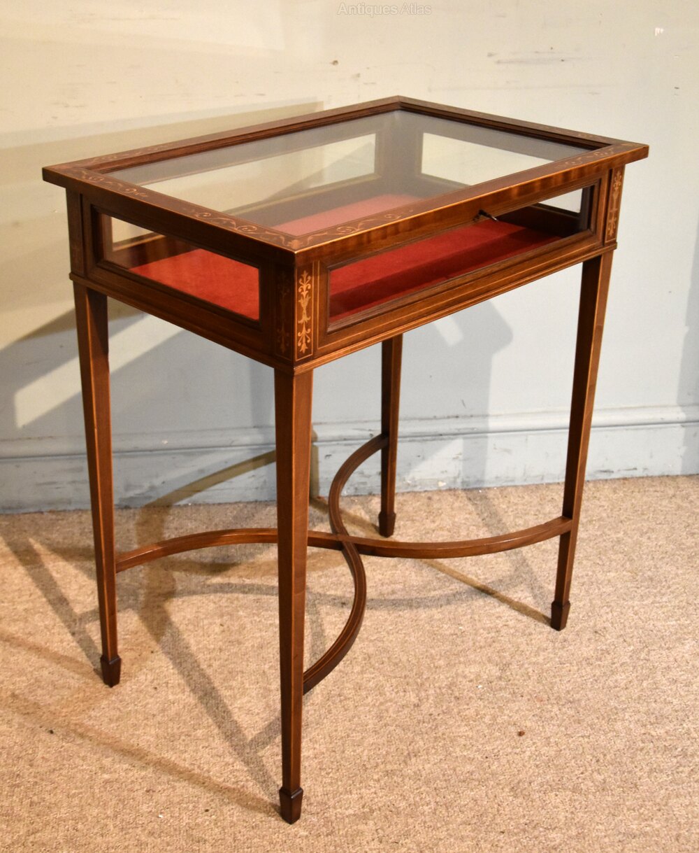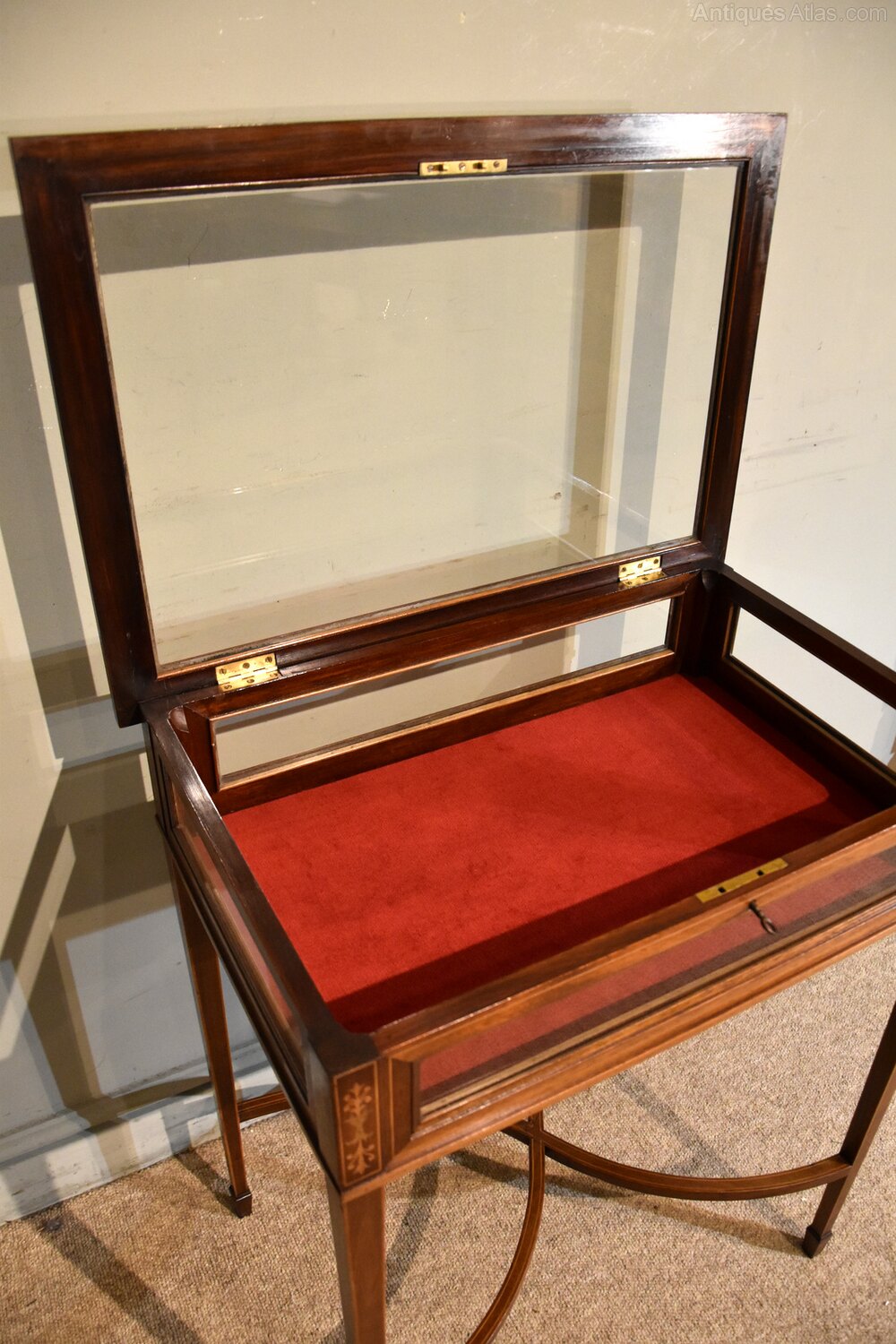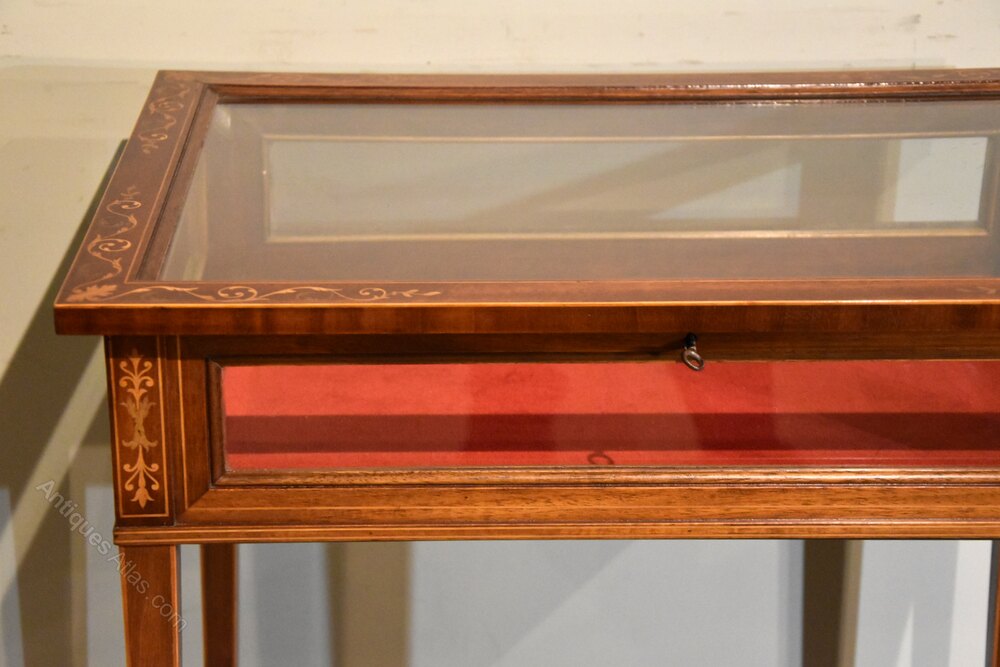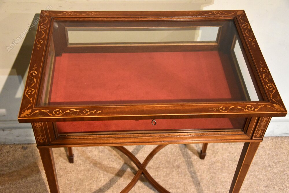 Late 19th century mahogany display or bijouterie table with fine inlays and stringing with working lock and key