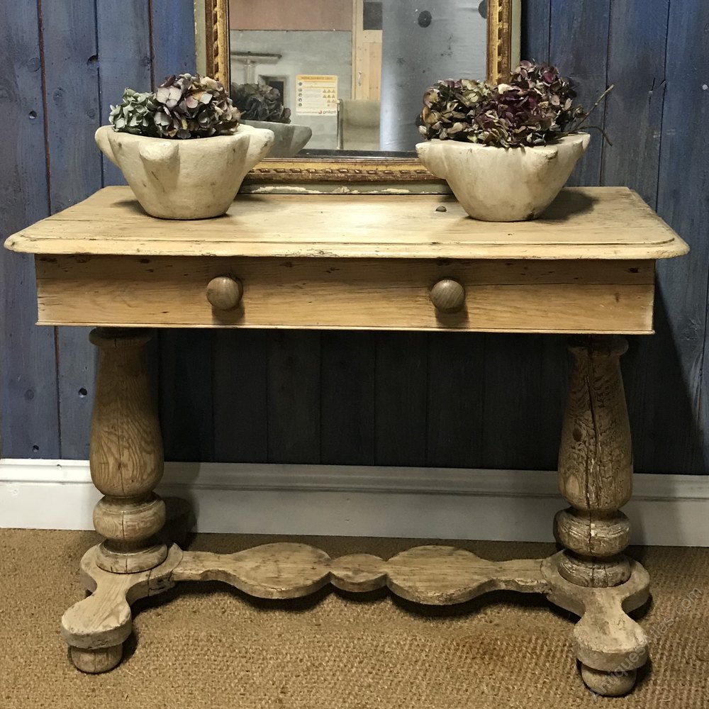 A well-proportioned pale pine console table with balustrade legs and decorative handles.