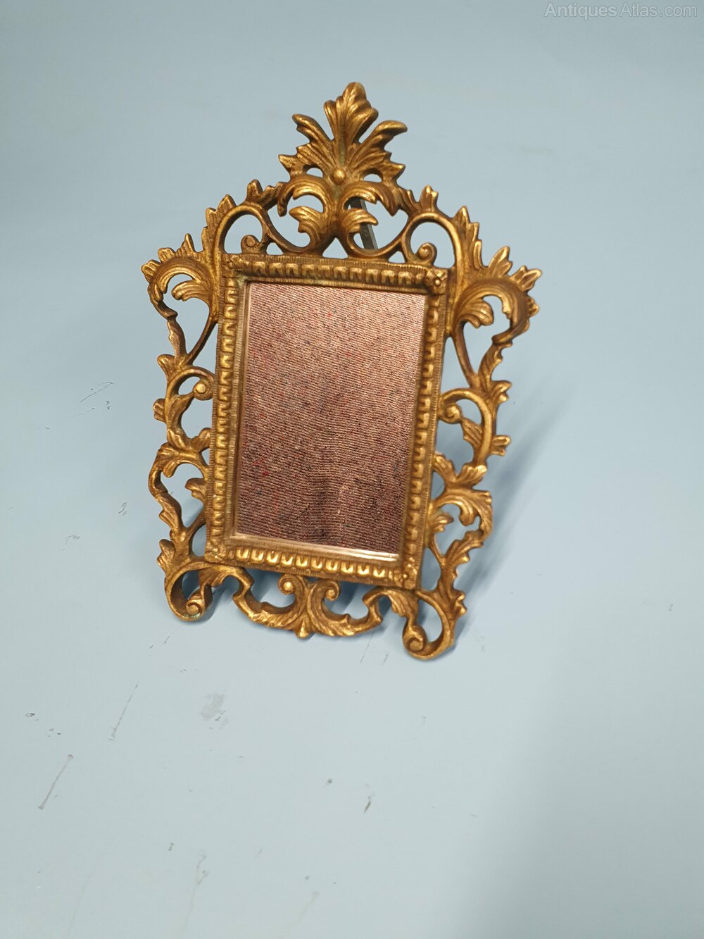 This small antique dressing mirror is in brass. It has a supporting arm to the back. The mirror is framed with a fine moulding, and the outer frame is decorated with C-scrolls and leaves in the William IV style. c.1890.