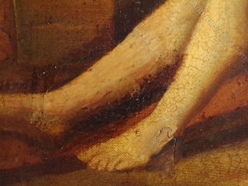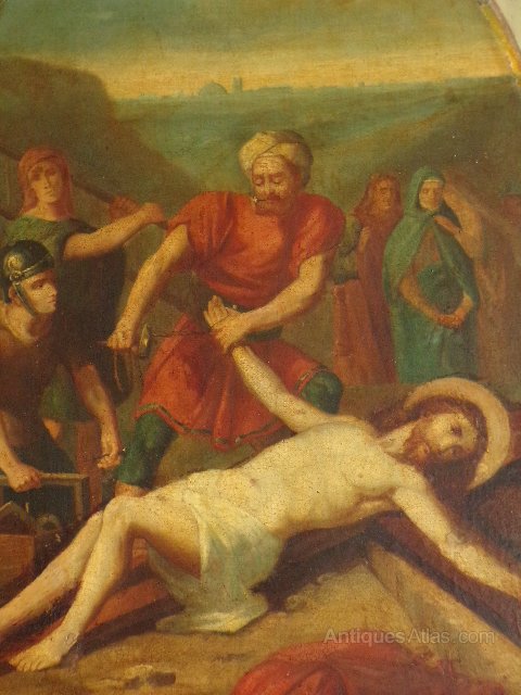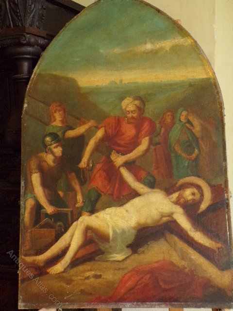 Late 20thc painting, Jesus is nailed to the cross, eleventh station. Oil on canvas laid to board with a tin backing to the stretcher.One of fourteen stations, which are all listed separately.