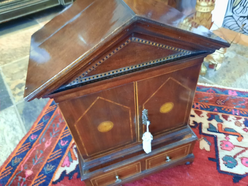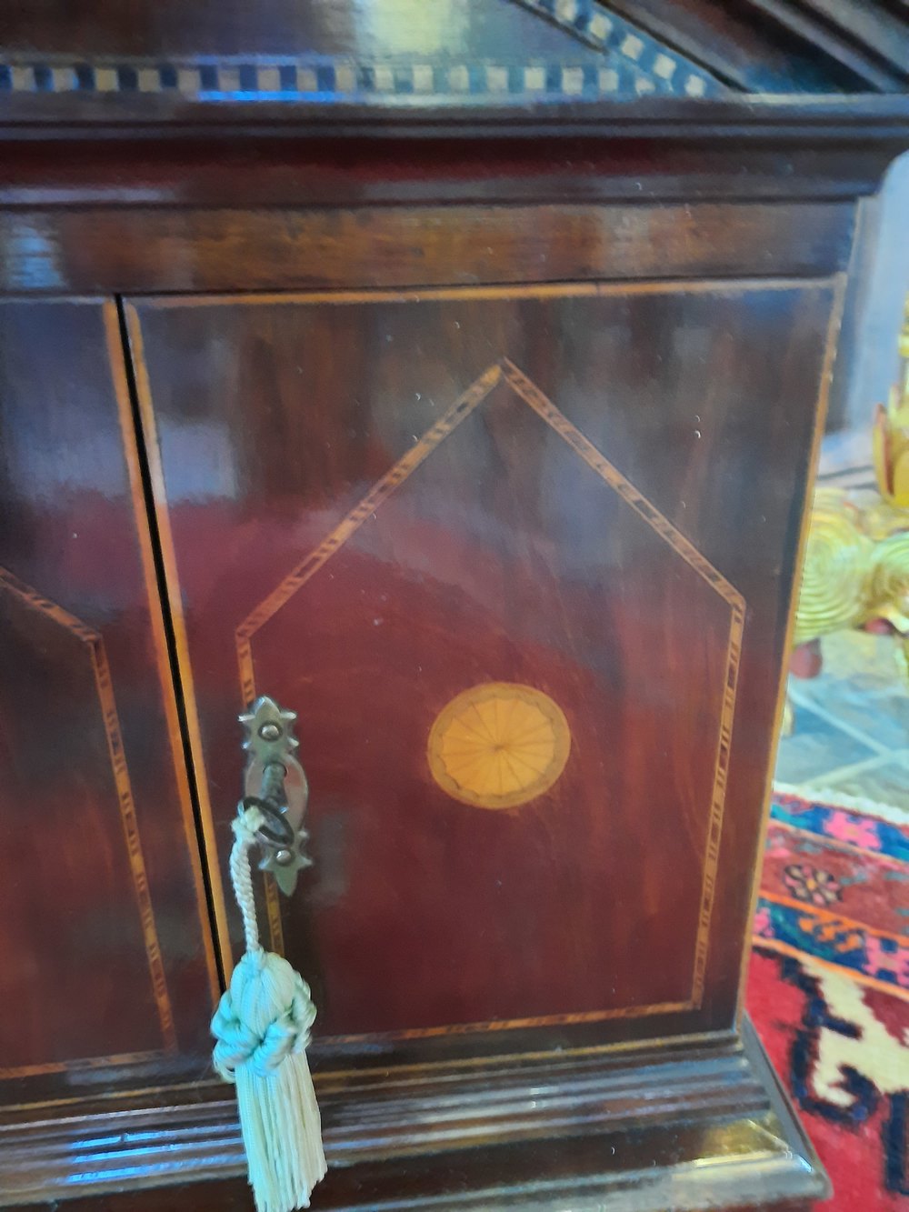 Late Georgian Mahogany Apprentice Piece in the form of a Miniature Linen Press with Starburst Inlay, Bracket Feet and Architectural Pediment 14"w x 10"d x 21"h