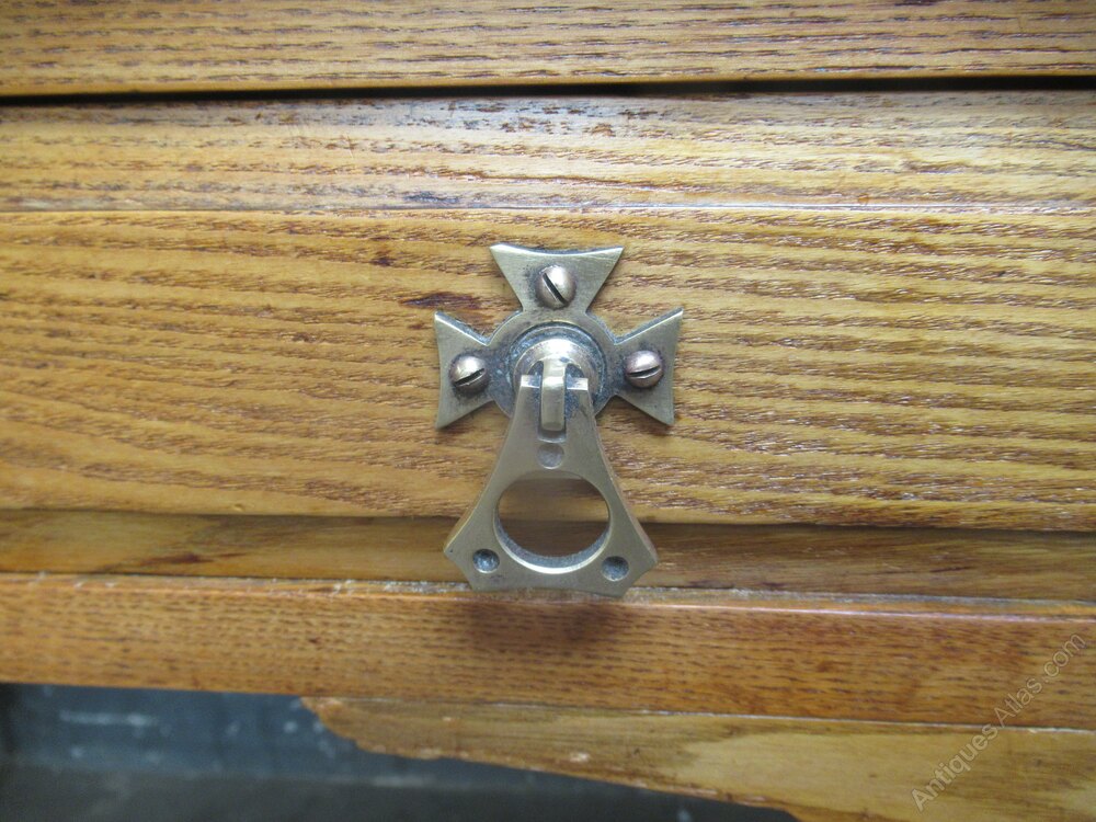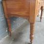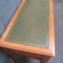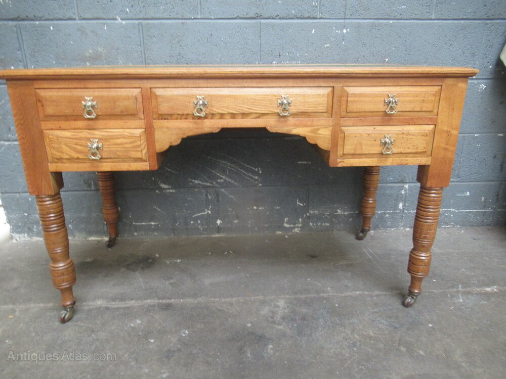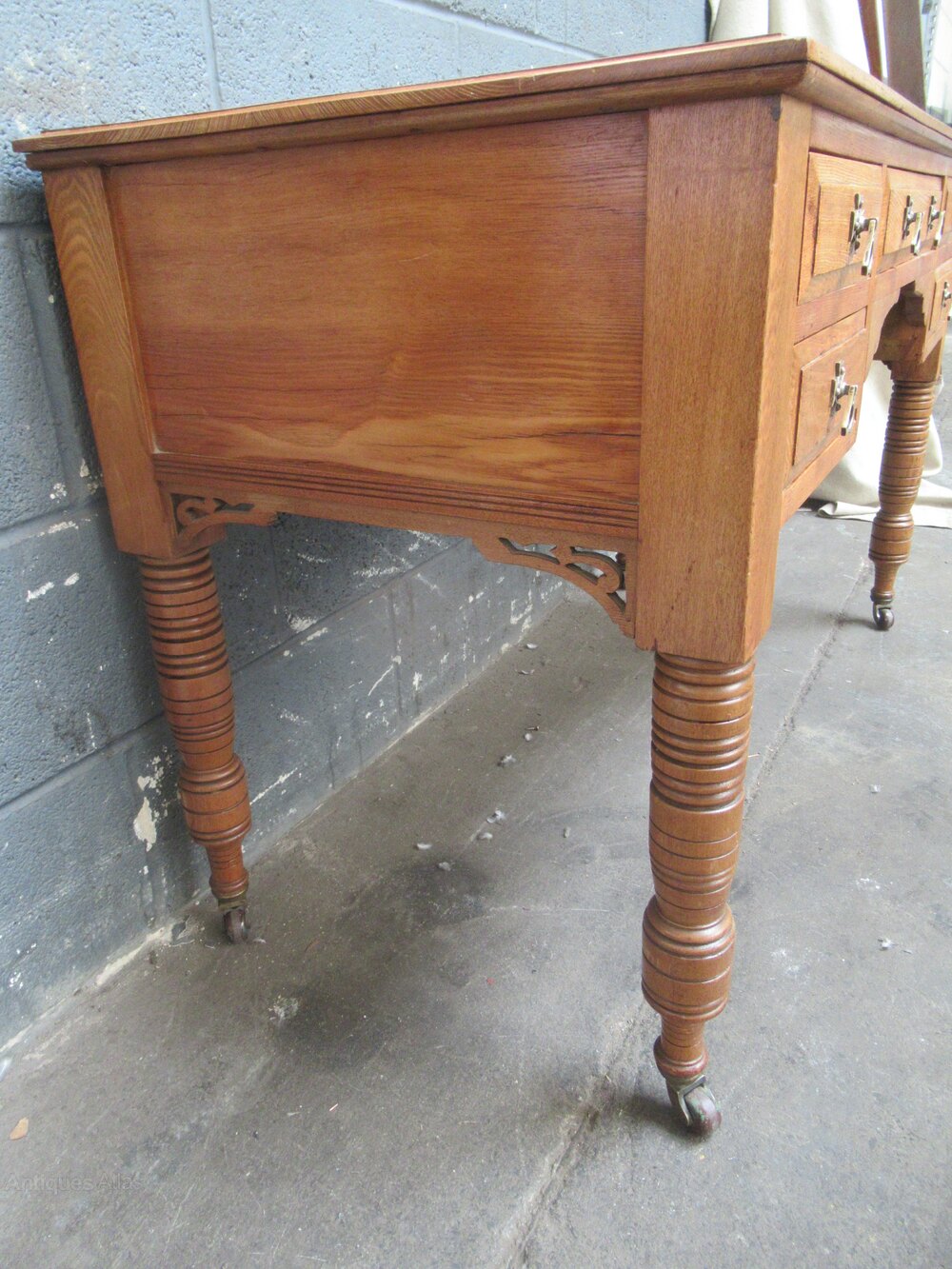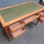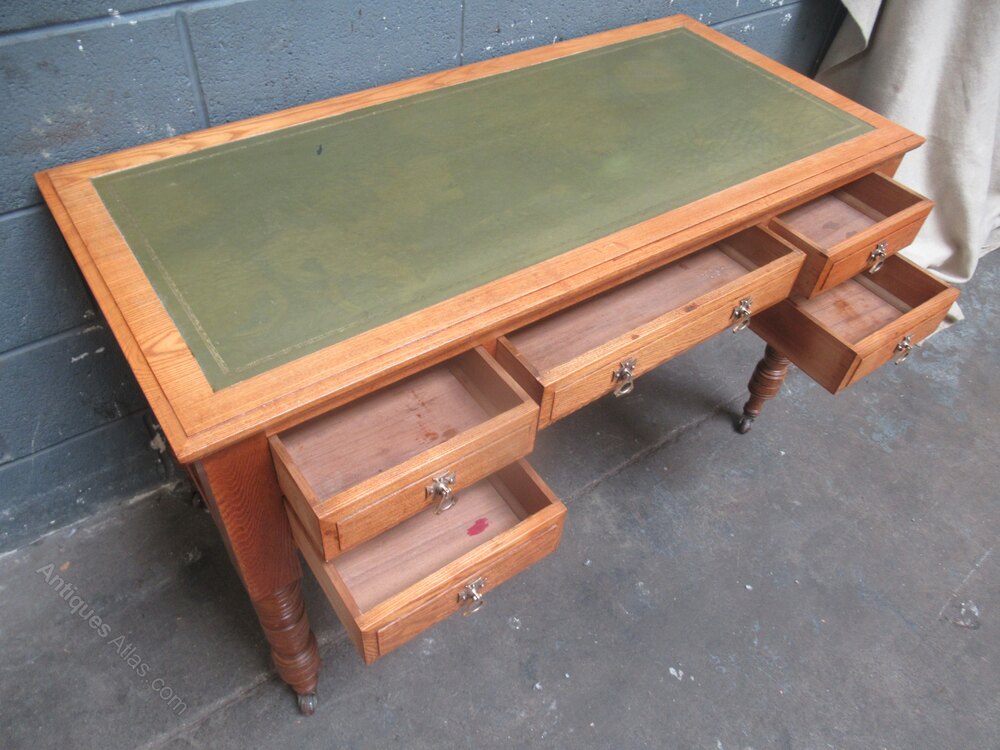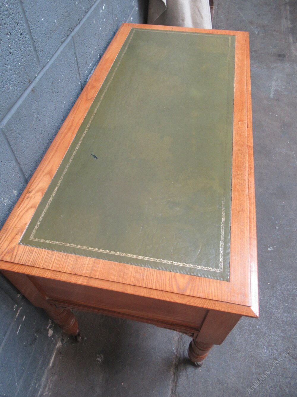 Late Victorian ash wood desk, with a olive green tooled leather liner to the top, with gilt edge tooling . The leather has some age wear marks . With five small drawers with brass handles. The desk stands on turned legs with casters.
